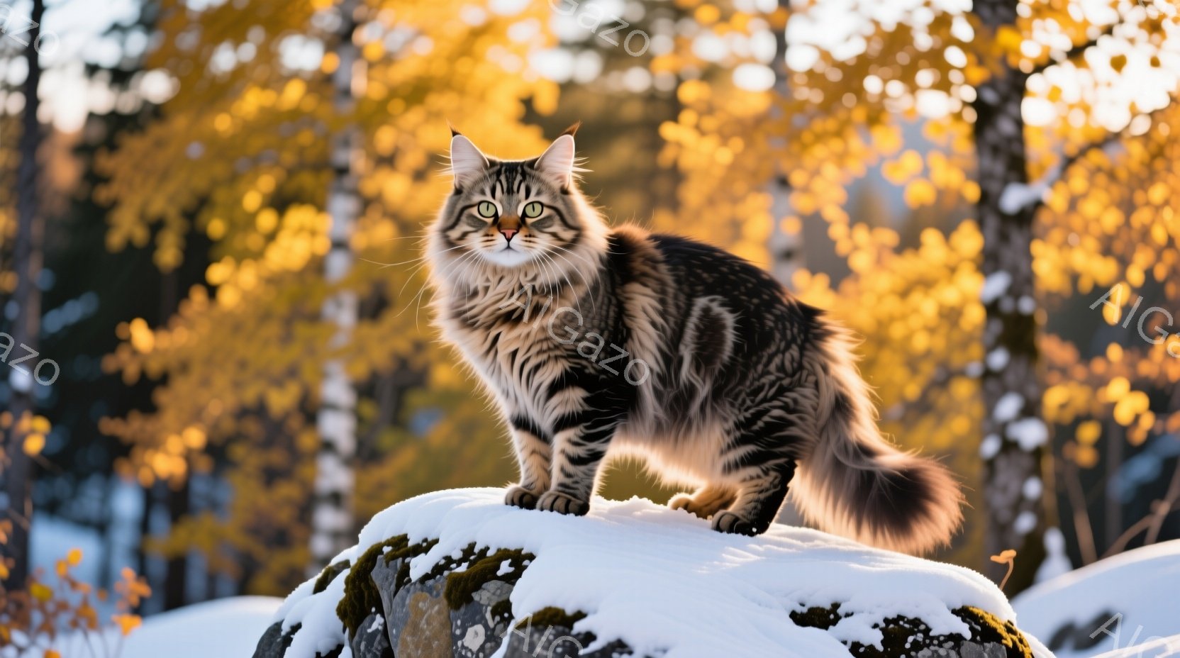 縞模様の大きな猫が雪に覆われた岩の上に堂々と立っている。背景には鮮やかな黄色の紅葉の木々が立ち並び、冬の暖かな光が差し込んでいる。猫の表情は落ち着いており、周囲の景色を見渡す様子がうかがえる。