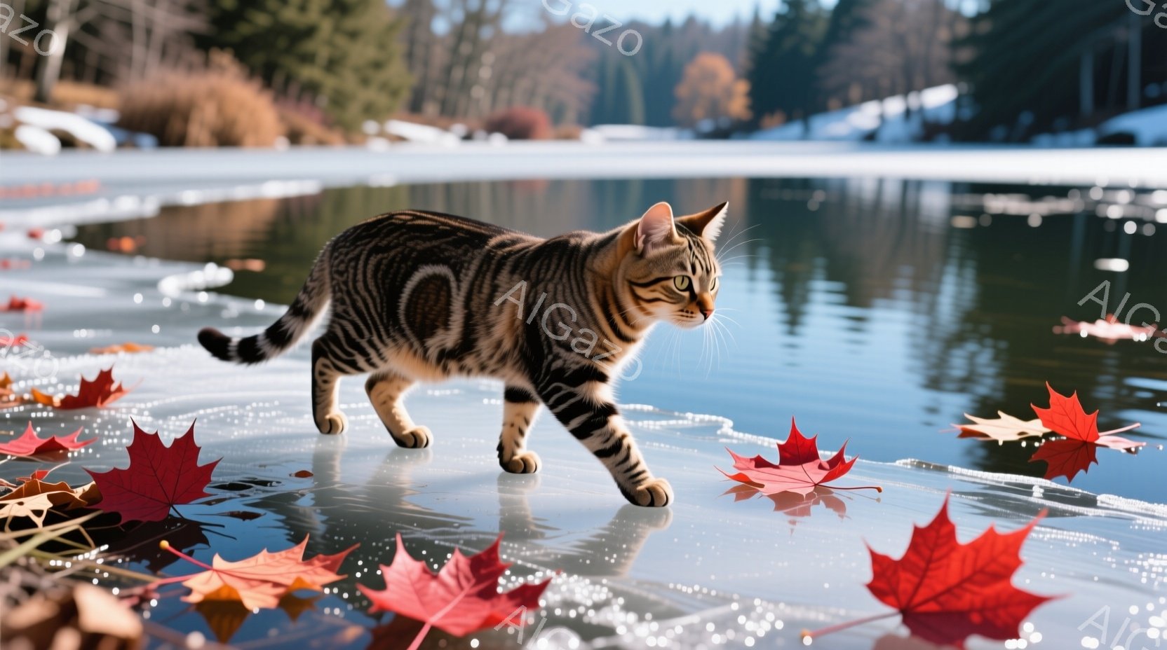 凍った湖の上を、縞模様の猫が慎重に歩いている。鮮やかな赤い紅葉が氷の上に散らばり、秋の風景を彩っている。背景には、緑豊かな森林と、水面に映る木々のシルエットが見え、静かで穏やかな雰囲気が漂っている。
