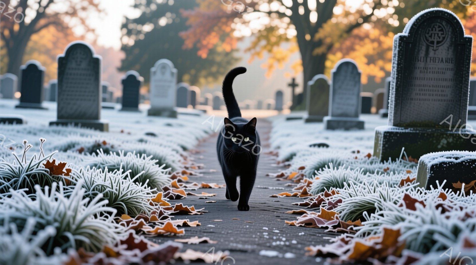 霜で覆われた墓地の小道を進む黒猫が写っています。猫はまっすぐ前を見据え、しなやかな姿勢で歩を進めており、まるで墓地の番人のようです。背景には、霜が降りた草地と、歴史を感じさせる石の墓標が並び、少し寂しげで神秘的な雰囲気が漂っています。