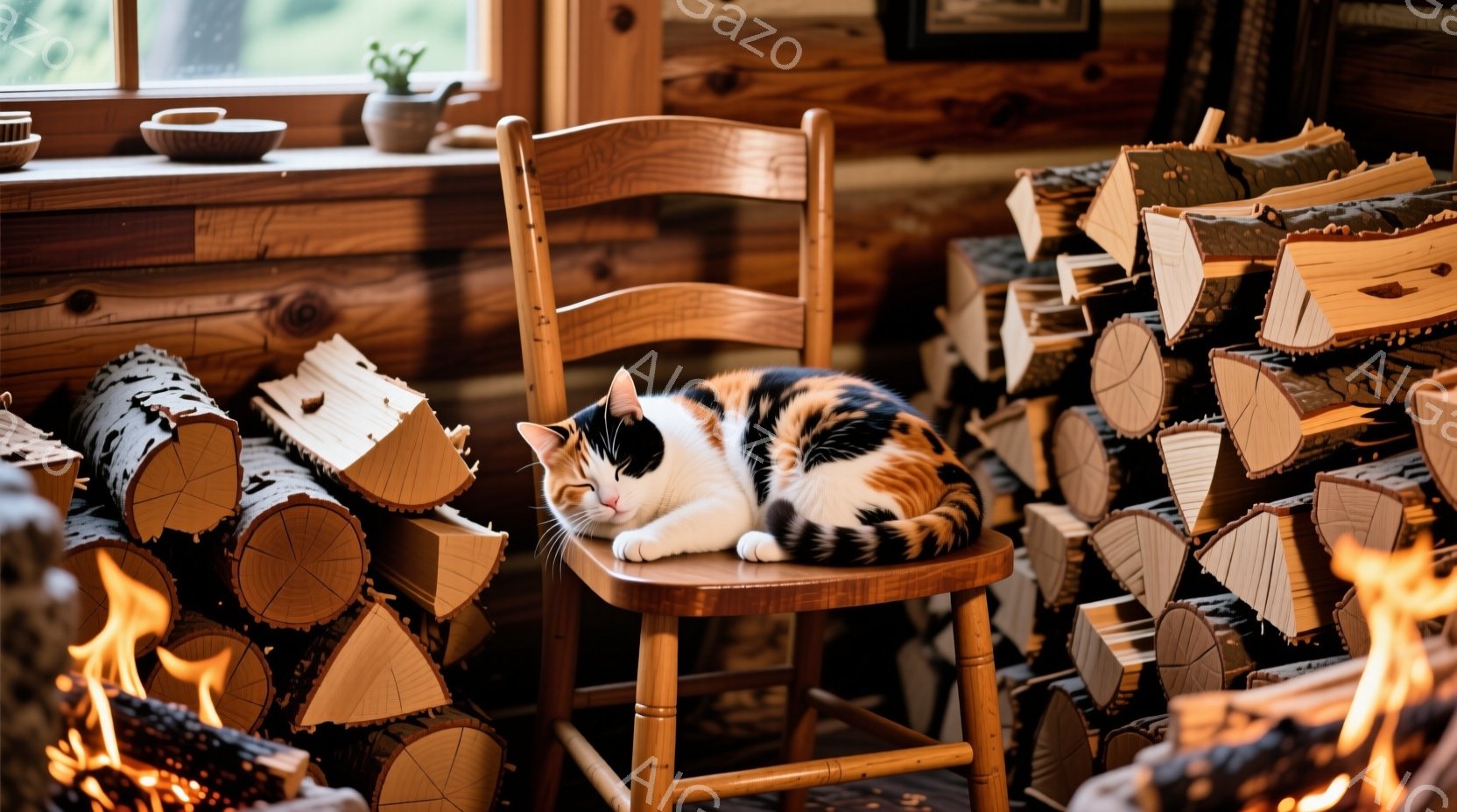 暖炉のそばの椅子に三毛猫が丸まって眠っています。椅子は木製で、背景には薪が積まれた棚と石造りの暖炉が見え、部屋全体が温かく居心地の良い雰囲気に包まれています。光の差し込み具合から、穏やかな昼下がりであることが伺えます。