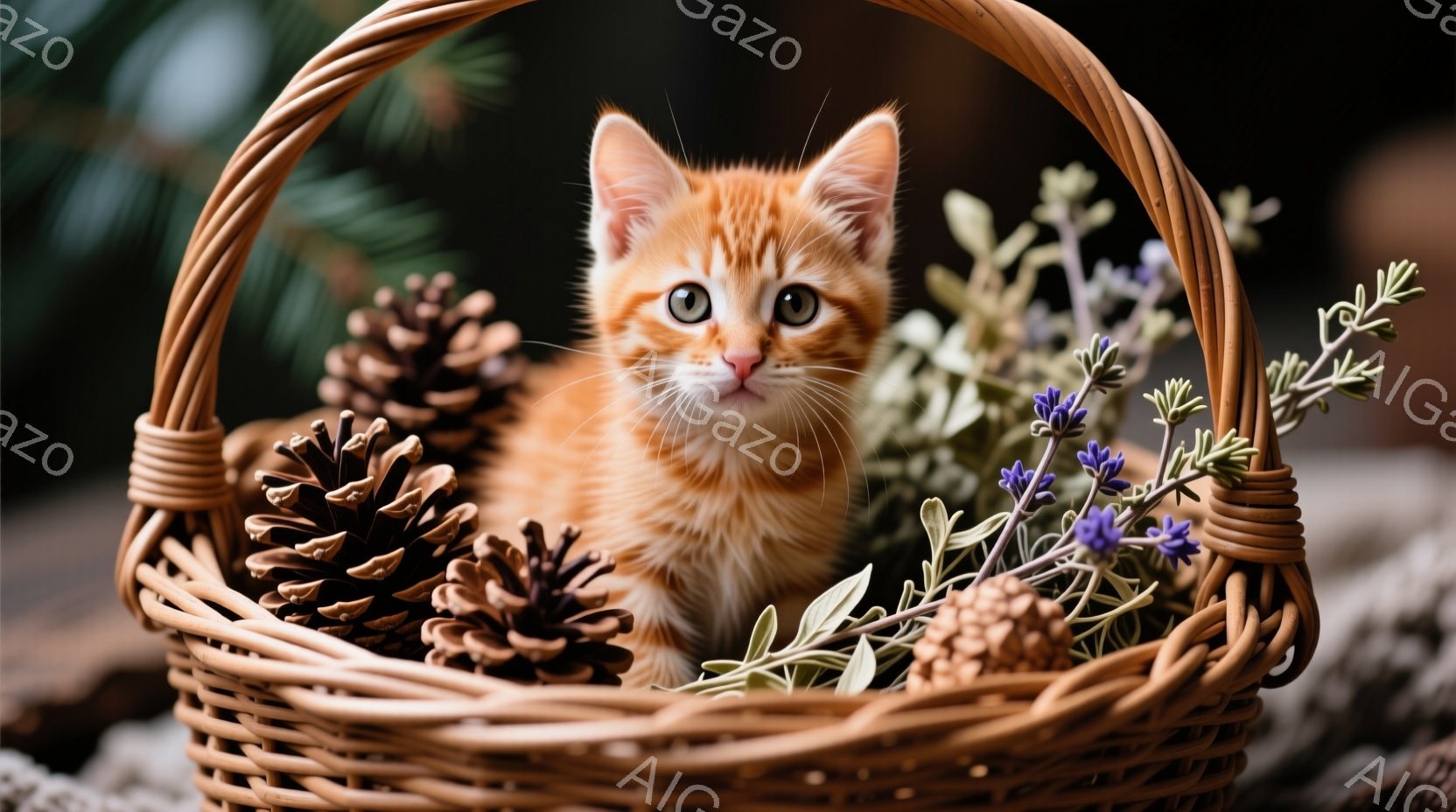 籠の中にオレンジ色の毛並みの小さな子猫が座っており、好奇心と穏やかさを示す丸い瞳で正面を見つめています。籠の中には、松ぼっくりと紫とオレンジ色の野花が添えられており、秋の穏やかな雰囲気を醸し出しています。背景はぼやけており、暖かく、居心地の良い印象を与えます。
