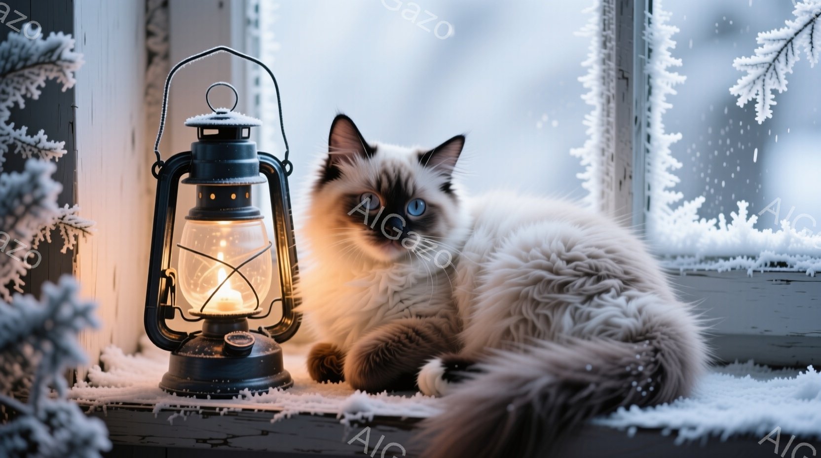 白い長毛の猫が窓辺に横たわっており、落ち着いた表情でカメラを見つめている。傍らには点灯した古い石油ランタンがあり、暖かい光が猫の毛並みを照らしている。窓は霜で覆われ、雪の降る冬の日の静かで穏やかな雰囲気を醸し出している。