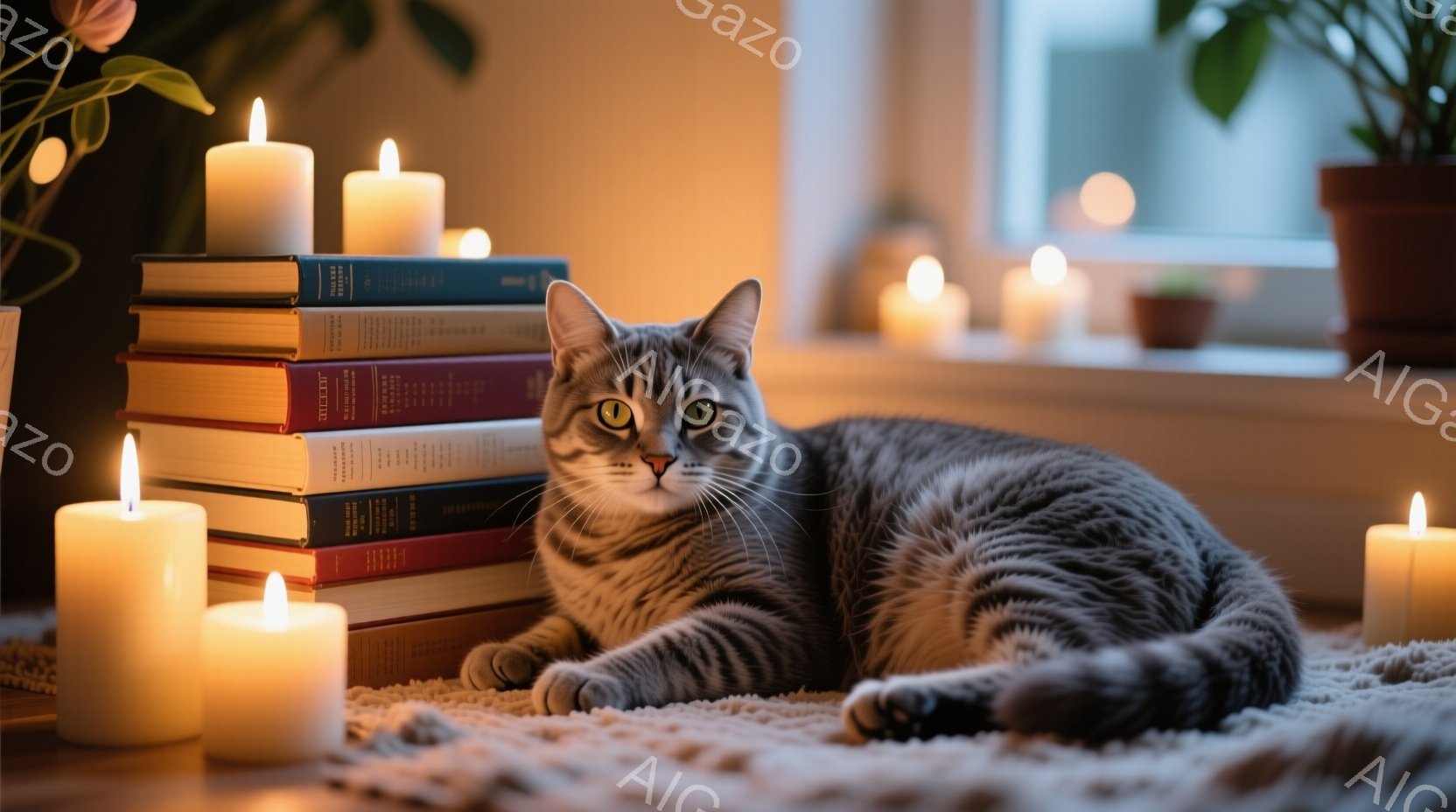 灰色の毛並みの猫が、積み重ねられた本の上に優雅に横たわっています。猫はカメラの方を見ており、少し眠たげで落ち着いた表情をしています。背景には、ぼんやりとした光の中で灯されたたくさんのキャンドルがあり、暖かく心地よい雰囲気を作り出しています。