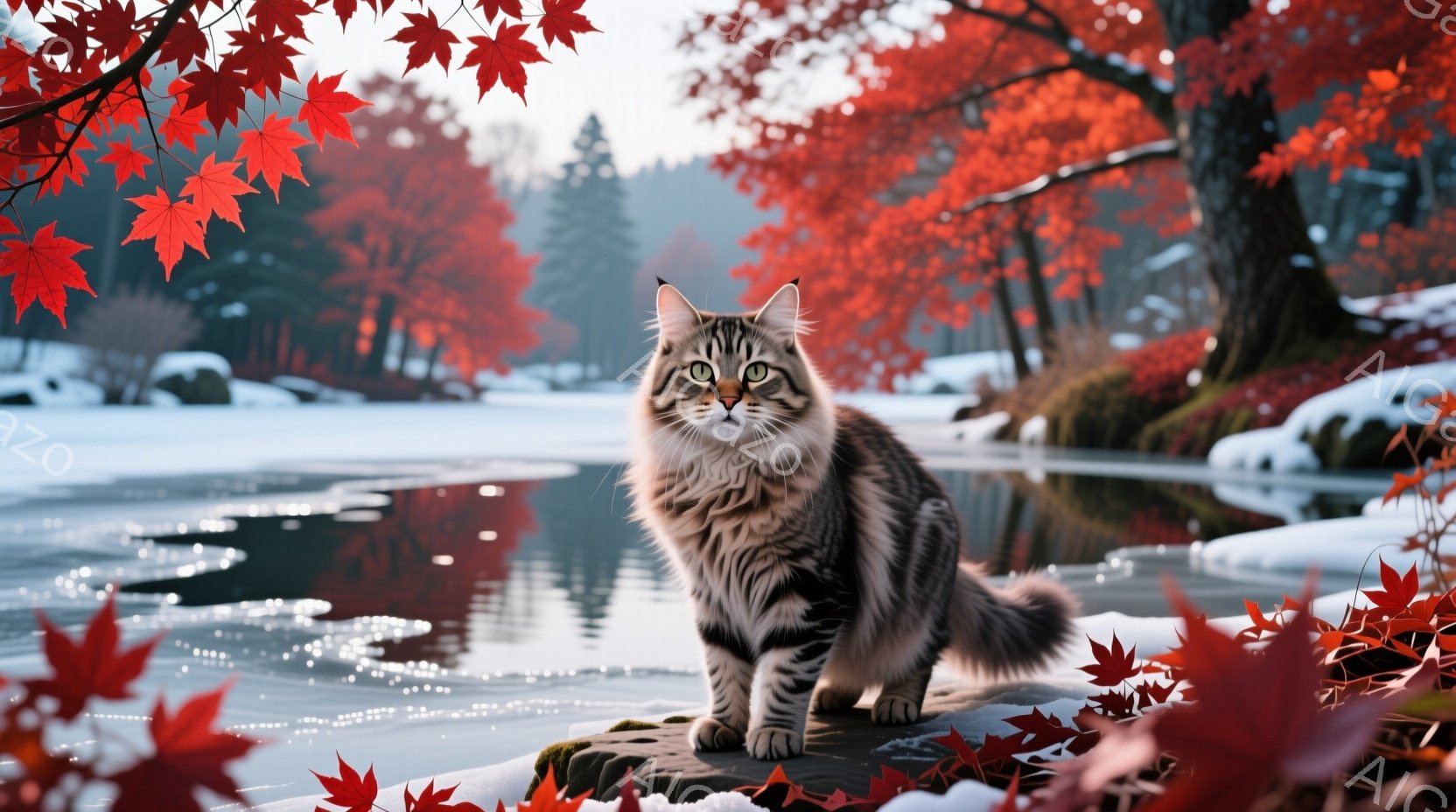 この無料AI生成画像「霜で覆われた草むらの中を、縞模様の美しい猫がこちらに向かって歩いてくる姿が捉えられています。猫は緑色の瞳でカメラを見つめ、凛々しい表情を浮かべています。背景は朝焼けに照らされた自然で、薄霧がかかり、静かで幻想的な雰囲気が漂っています。」は、2025年10月23日に作成されました。 サイズは 1664×928px の高解像度で、商用利用も可能なフリー素材として提供しています。