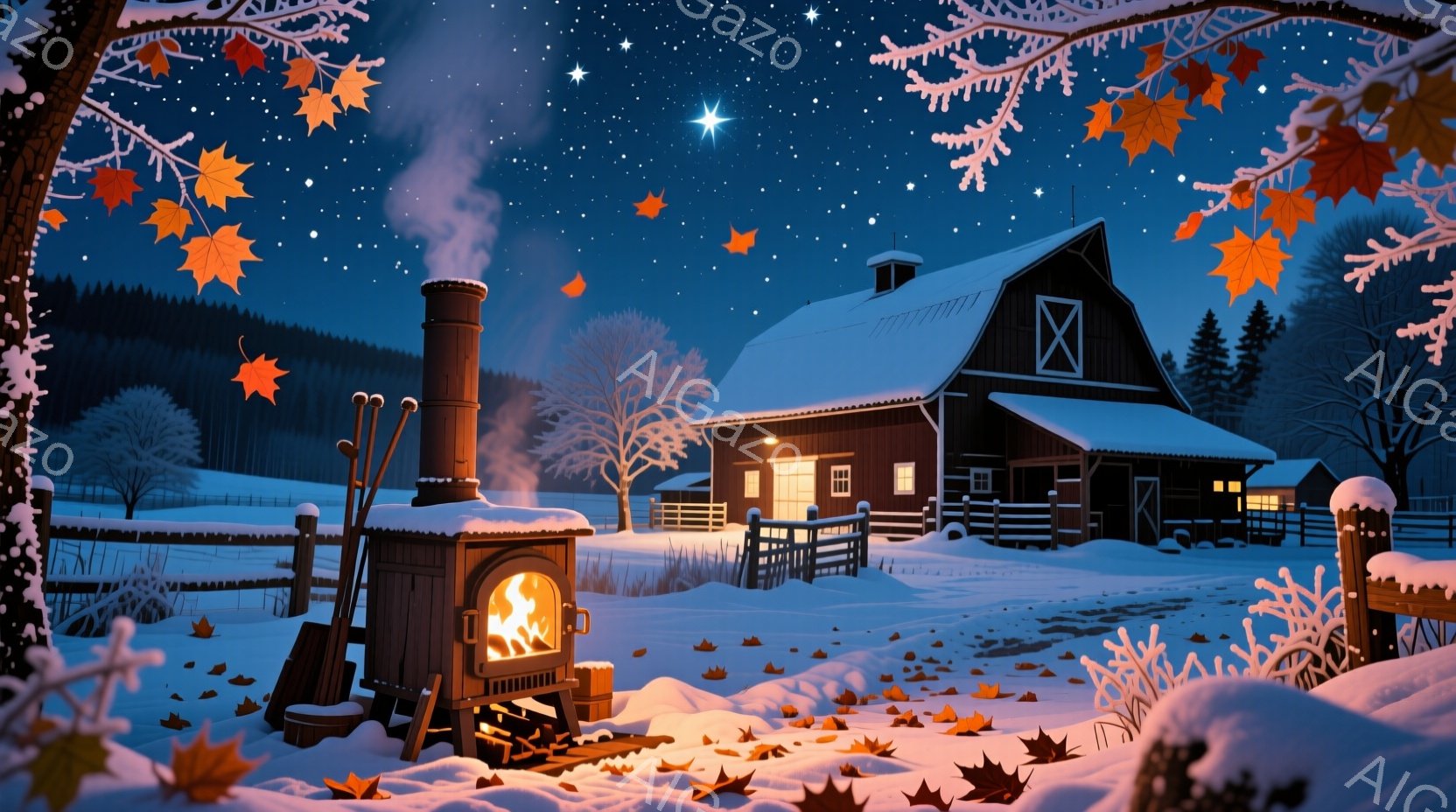 雪に覆われた夜の農場が描かれています。黒い木造の納屋からは暖かな光が漏れ、煙突から立ち上る煙が寒さを和らげています。雪原には散りばめられた紅葉が鮮やかなアクセントとなり、夜空には星が輝き、静かで穏やかな冬の雰囲気を醸し出しています。
