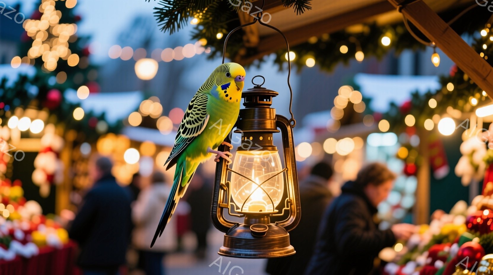 明るい提灯にインコが止まっています。インコは鮮やかな緑、青、黄色で、好奇心旺盛な表情でカメラを見ているようです。背景はクリスマスマーケットのような賑やかな雰囲気で、ぼやけた人影やカラフルな商品、そしてキラキラと輝く光が楽しげな雰囲気を醸し出しています。