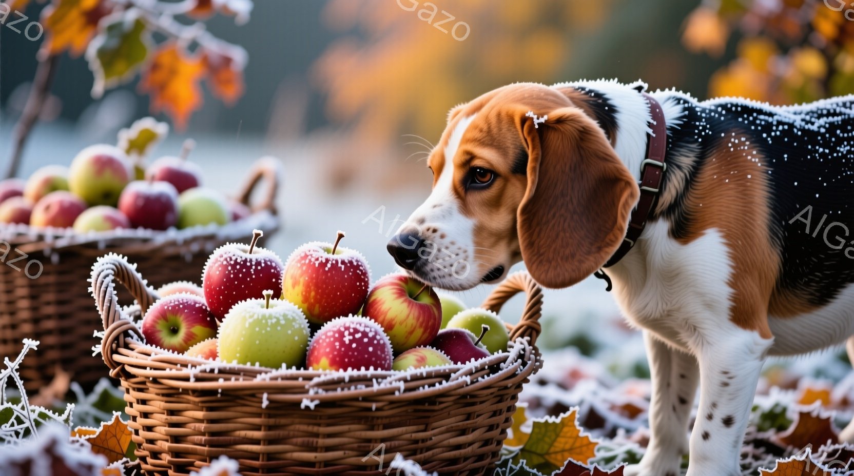 白と茶色の毛並みを持つビーグル犬が、霜で覆われた赤いリンゴがたくさん入ったバスケットに鼻を近づけています。背景には、鮮やかな秋色の葉が散りばめられた自然豊かな風景が広がり、冷たい空気と秋の収穫の雰囲気が感じられます。犬は落ち着いた表情で、バスケットとリンゴに興味津々でそっと匂いを嗅いでいるようです。