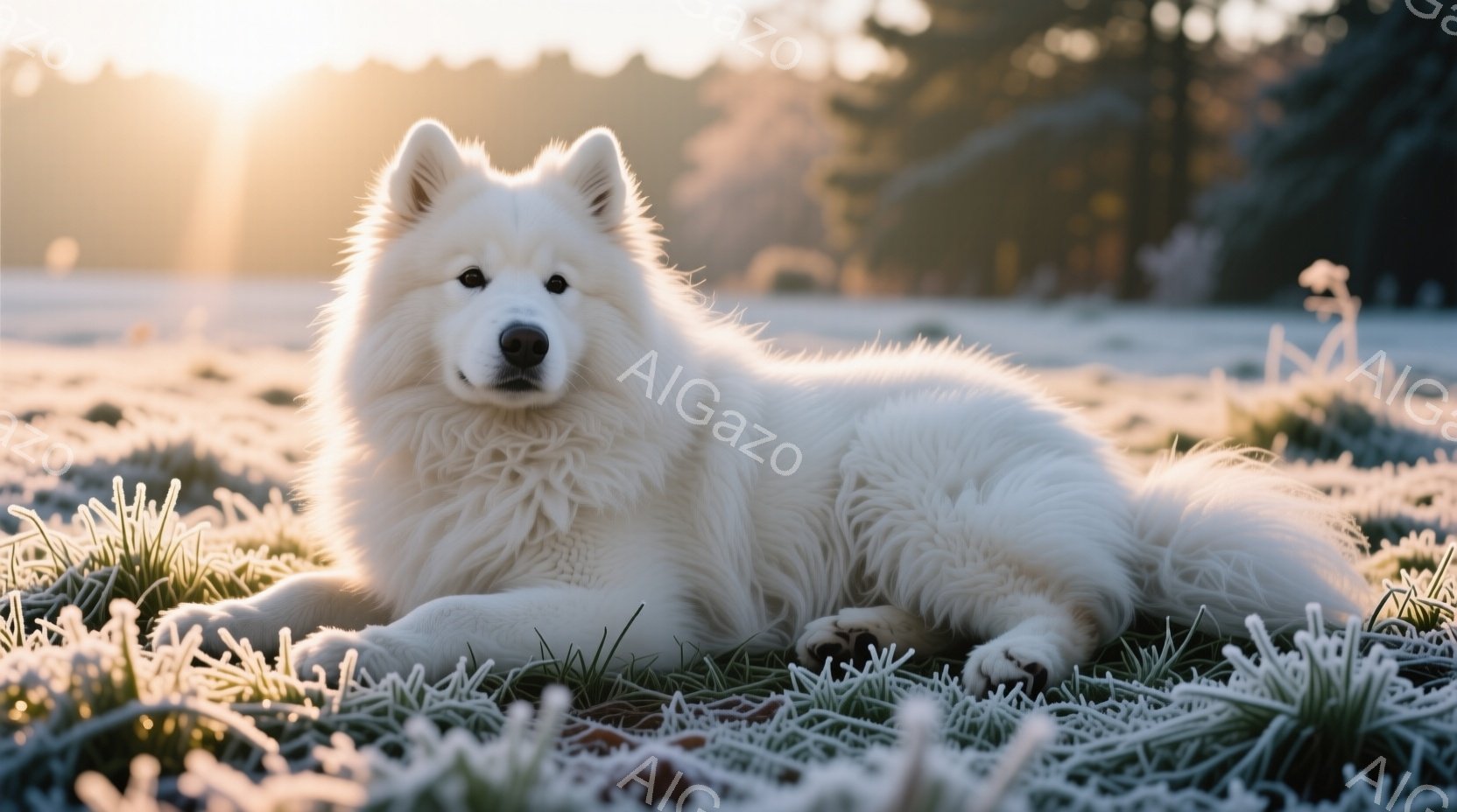 白い毛並みの大型犬が、霜が降りた草原に横たわっています。犬は穏やかな表情で正面を見つめ、冬の朝日に照らされています。背景には木々がぼやけて見え、全体的に静かで幻想的な雰囲気が漂っています。