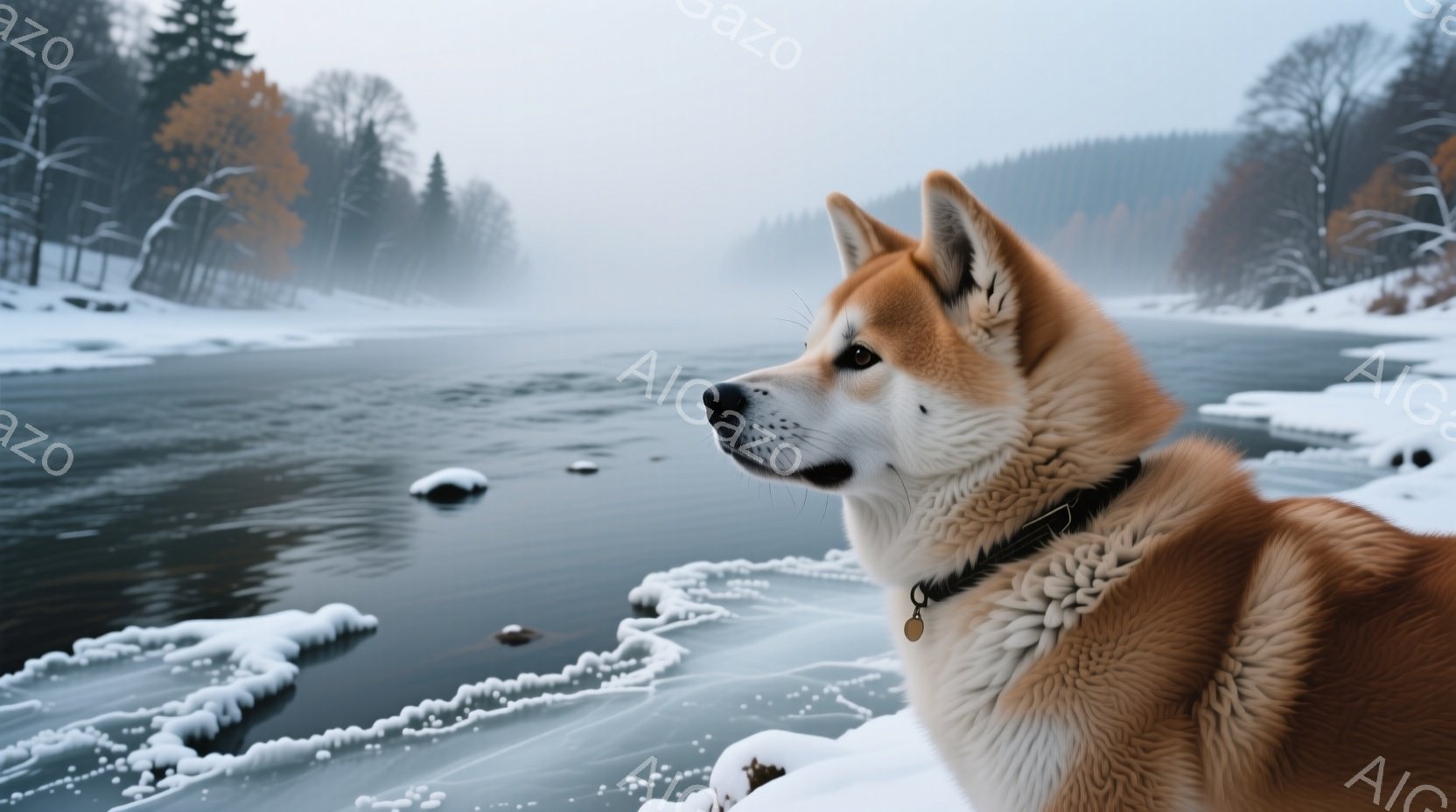 柴犬が雪景色の中で、凍った川岸を見つめている。犬は茶色の毛並みで、首輪をつけており、凛々しい横顔を見せている。背景にはうっすらと霧がかかった木々が広がり、冬の静寂な雰囲気を醸し出している。