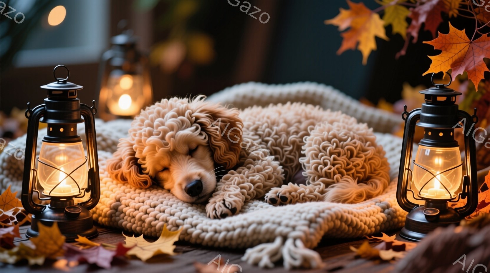 ふわふわのクリーム色の犬が、ざっくり編まれたオフホワイトの毛布の上で丸まって眠っています。背景には、落ち葉と点灯したランタンがいくつかあり、暖かく穏やかな秋の雰囲気を醸し出しています。犬の足元には、赤や黄色の落ち葉が散らばっており、季節感を強調しています。