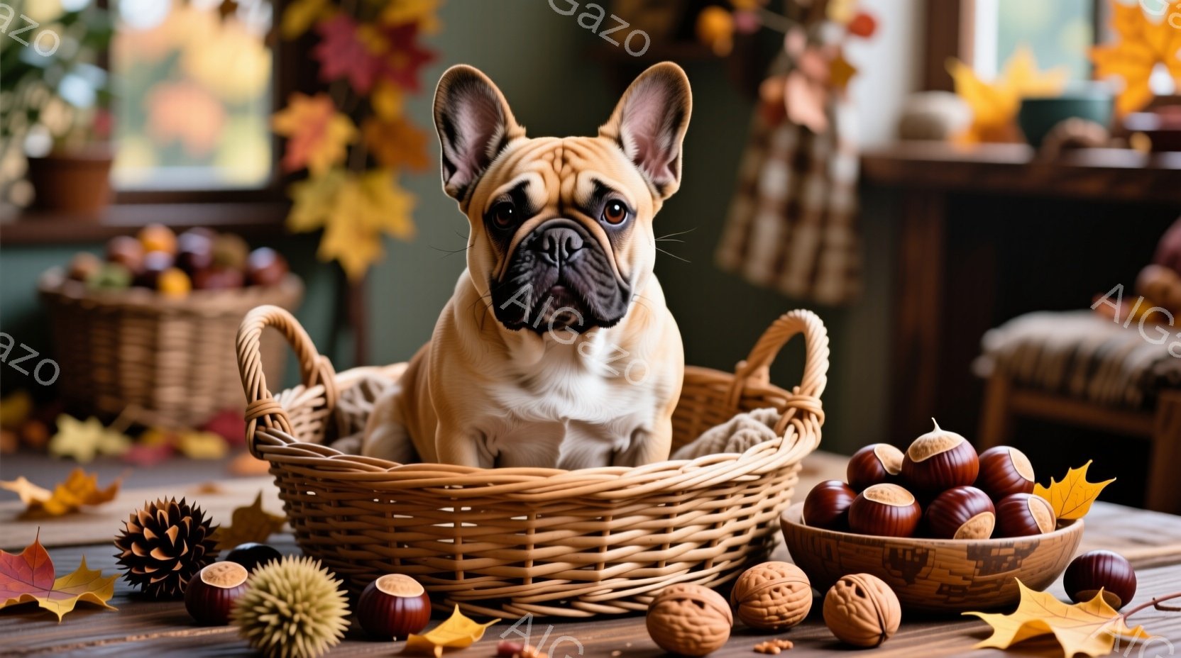 籐編みの籠の中に、愛らしいフレンチブルドッグがちょこんと座っています。籠の中には栗やどんぐりが散りばめられ、その周りにも散らばって秋の雰囲気を演出しています。背景には、他の籠と秋らしい飾り付けが見え、暖かく穏やかな季節の訪れを感じさせます。