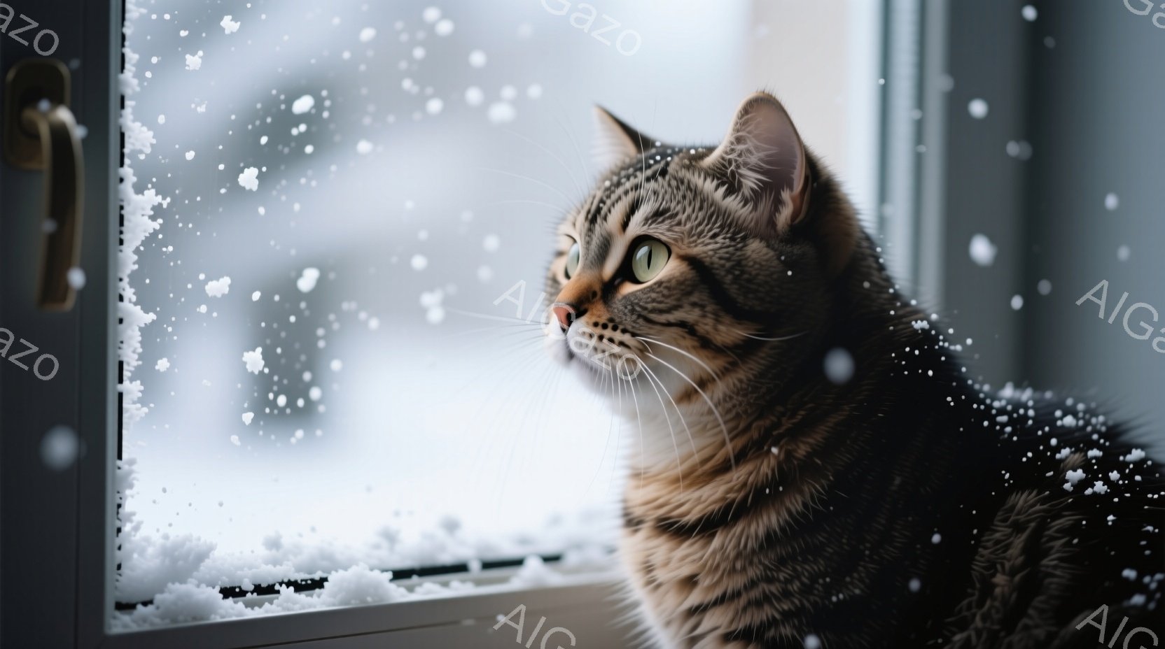 茶色の縞模様の猫が窓の外を眺めています。窓ガラスには雪が降り積もり、背景は白くぼやけています。猫は少し首をかしげ、好奇心と静けさのある表情で冬の風景を観察しています。