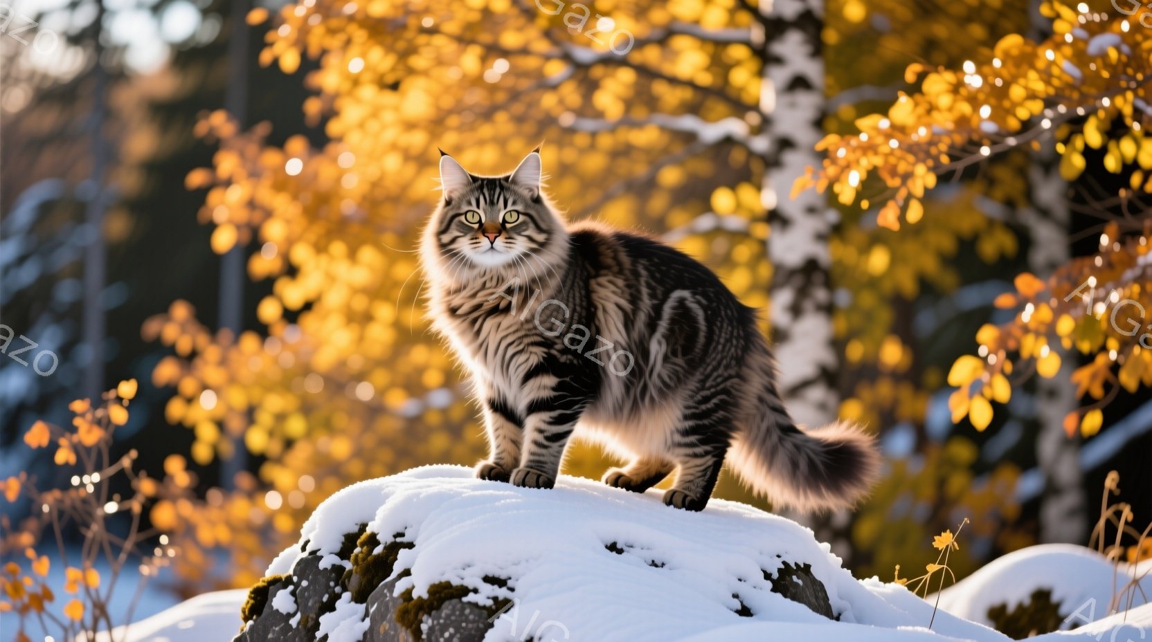 長毛の縞模様の猫が雪に覆われた岩の上に立っている。背景には鮮やかな黄色の紅葉と、暗い緑の針葉樹林が広がっており、冬の澄んだ空気を感じさせる。猫は凛とした表情で遠くを見つめ、冬の自然の中で堂々と生きる姿を表現している。