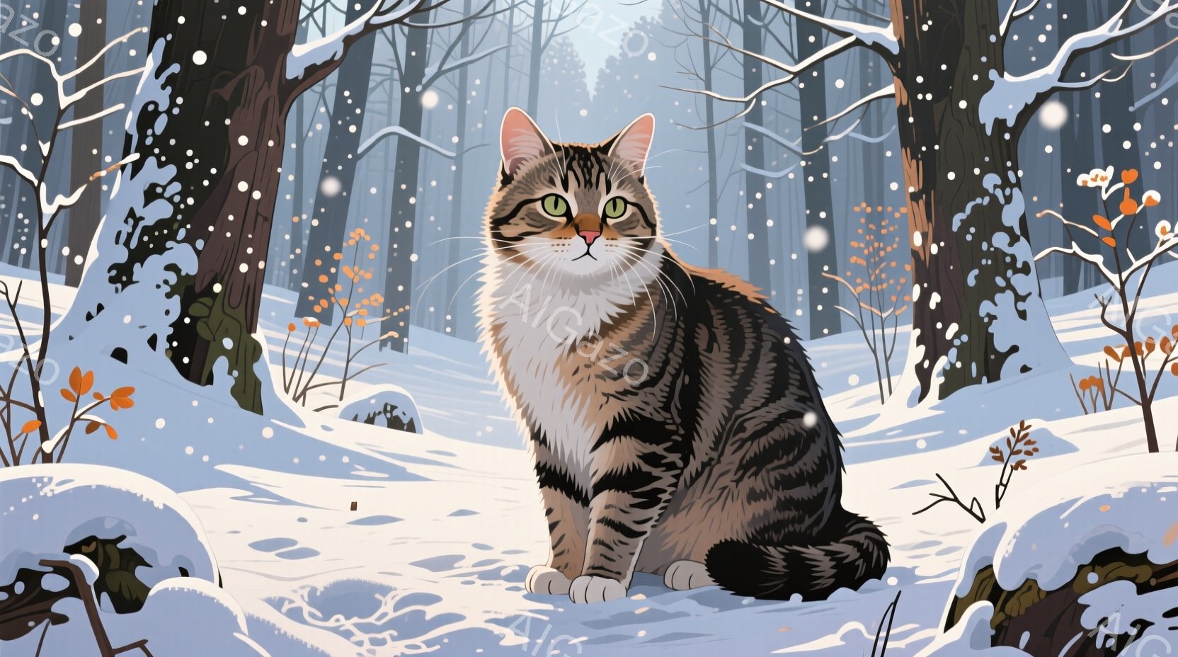 雪景色の中に、縞模様の茶トラ猫が座っている。猫は前方を少し見上げ、静かに周囲を観察しているように見える。背景には雪に覆われた木々が生い茂り、冬の静寂で冷たい雰囲気が漂っている。