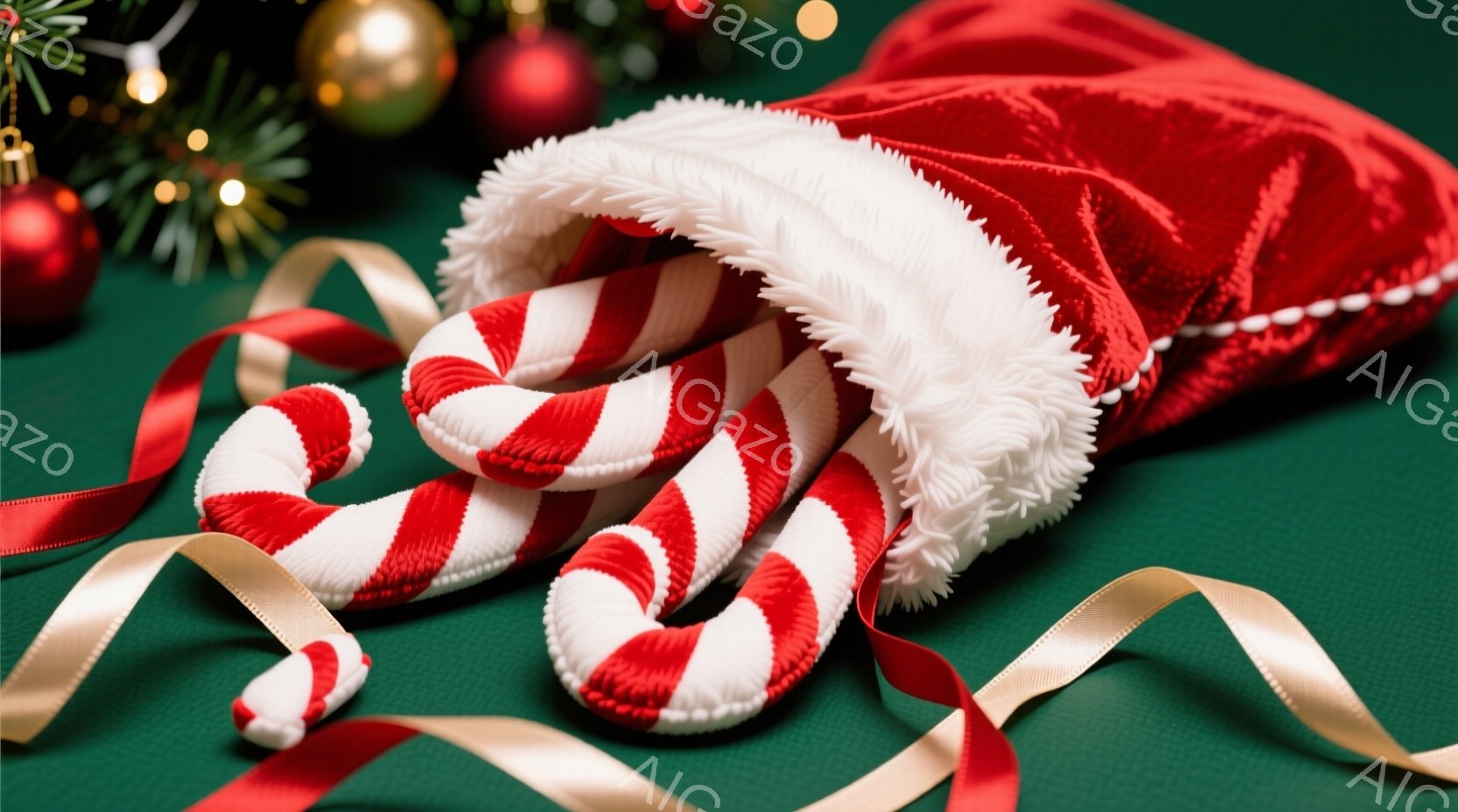 深緑色の背景に、クリスマス柄のキャンディケーンとサンタ帽が写っています。キャンディケーンは赤と白のストライプで、サンタ帽の白い毛皮のような縁に寄りかかっています。赤いリボンと緑色のリボンが背景に散りばめられ、クリスマスの暖かくお祝いムードを醸し出しています。