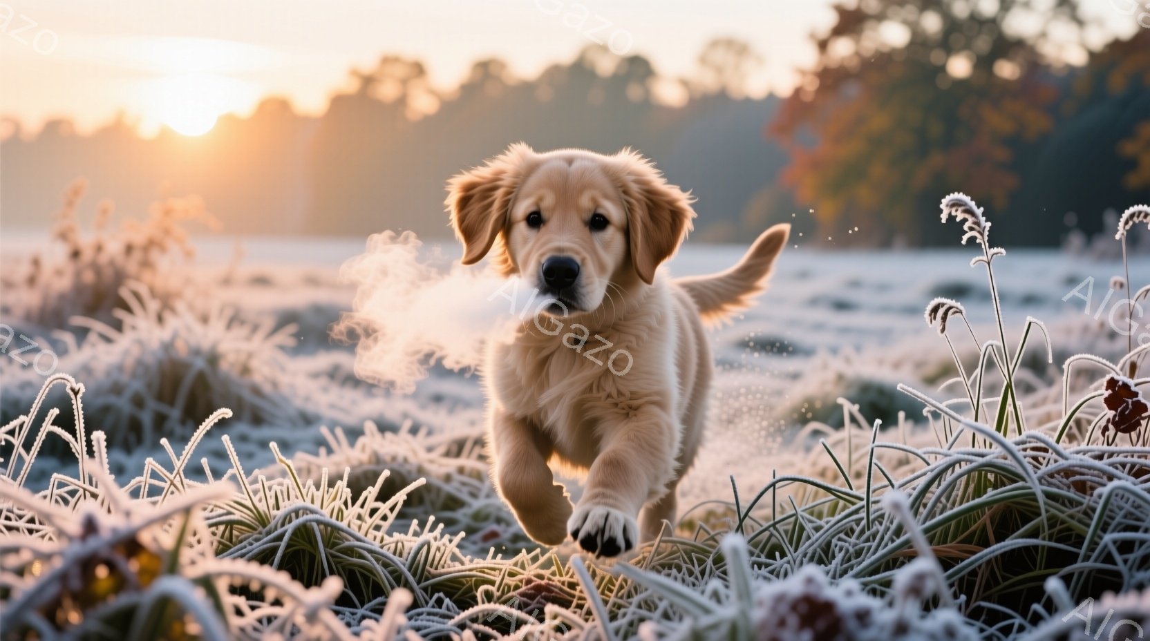 金色の毛並みを持つ子犬が、霜が降りた草原の中を駆け抜けている。口からは白い息が立ち上り、楽しそうな表情で、草原の植物に付いた霜がキラキラと輝いている。背景には木々が見え、空は夕焼けのような暖かい色合いで、冷たい空気の中に暖かさを感じさせる。