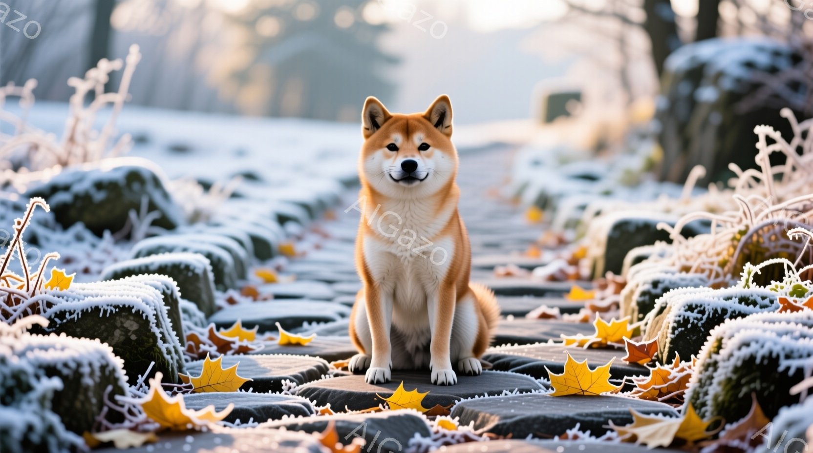 柴犬が、霜で覆われた木製の柵に沿った石畳の道に座っています。犬は正面を向き、穏やかな表情で、少し微笑んでいるように見えます。背景は冬の森で、霜で覆われた木々が並び、全体的に静かで穏やかな雰囲気を醸し出しています。