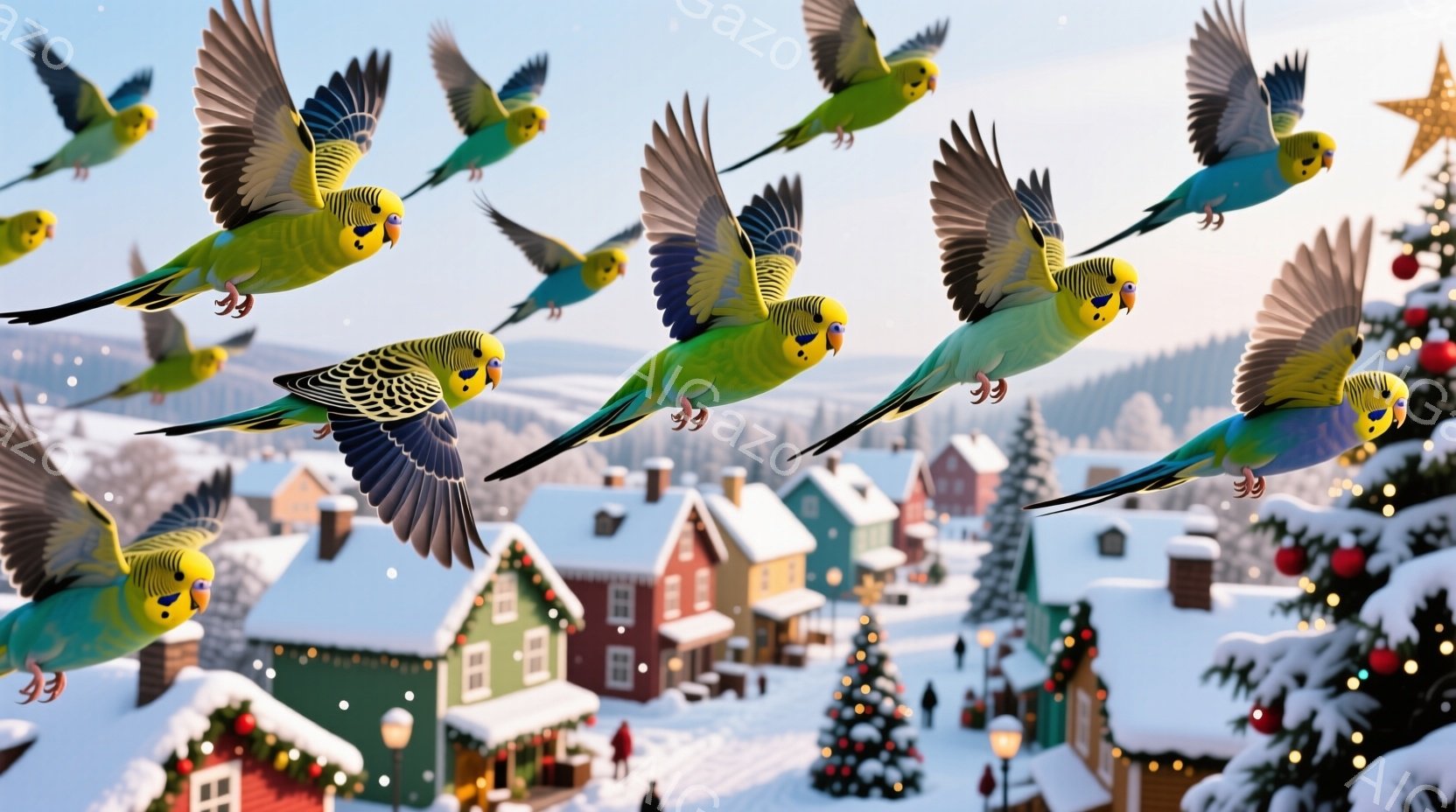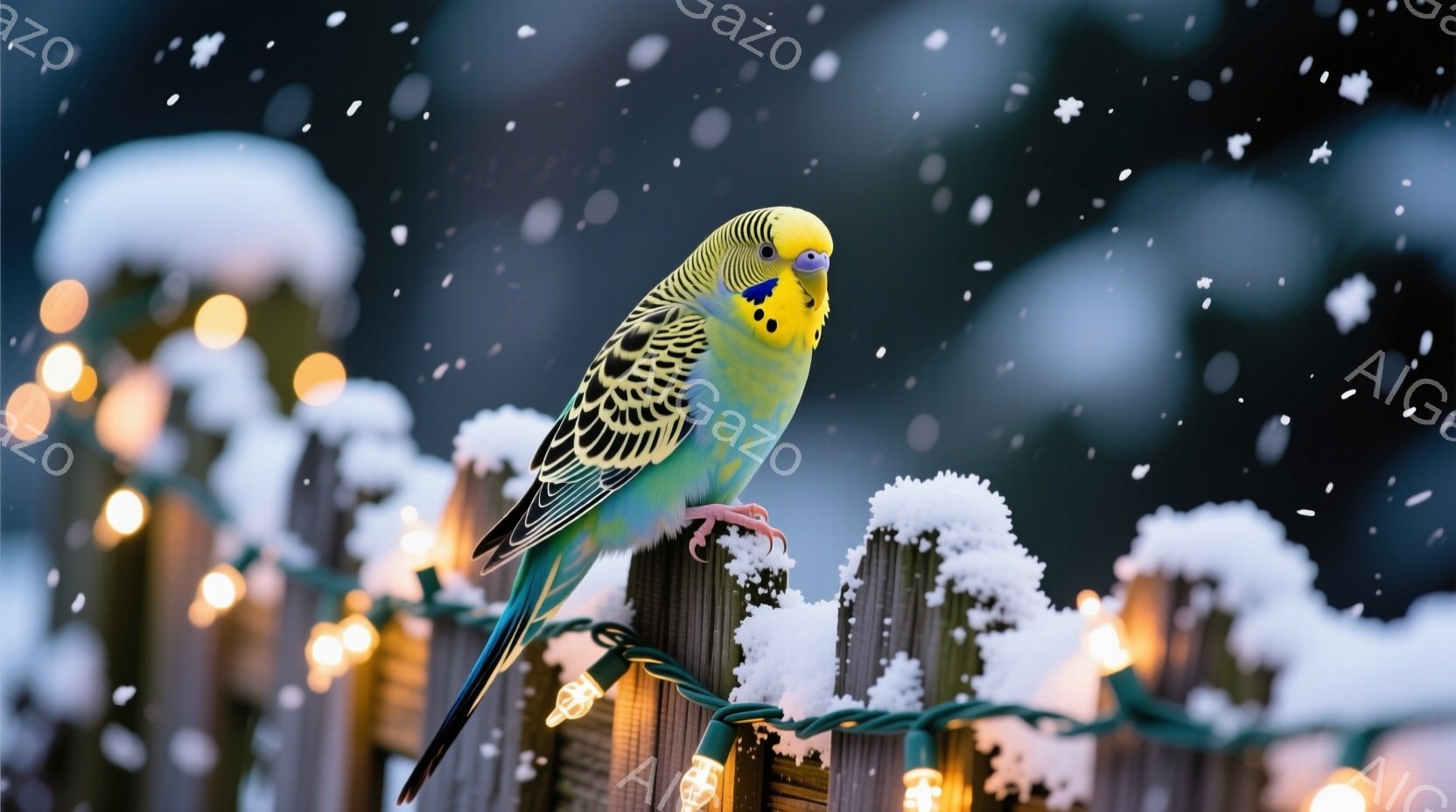 セキセイインコが雪の積もった木の柵にとまっており、その鮮やかな青と黄色の羽毛が際立っている。背景にはぼやけたクリスマスライトが点在し、冬の幻想的な雰囲気を醸し出している。インコの表情は穏やかで、冷たい冬の風景の中でひときわ明るい存在感を放っている。