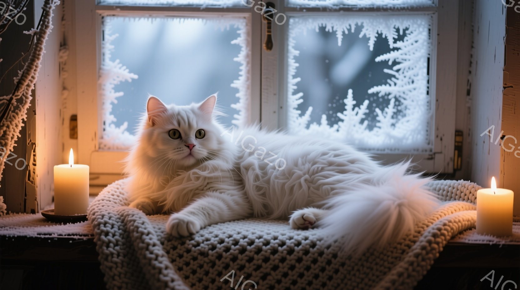 ふわふわの白い長毛の猫が窓辺の白いニットのクッションの上でくつろいでいます。窓の外には雪が降り積もり、キャンドルの灯りが暖かく猫を照らしています。背景にはクリスマスの飾りが見え、冬の穏やかで心地よい雰囲気が漂っています。