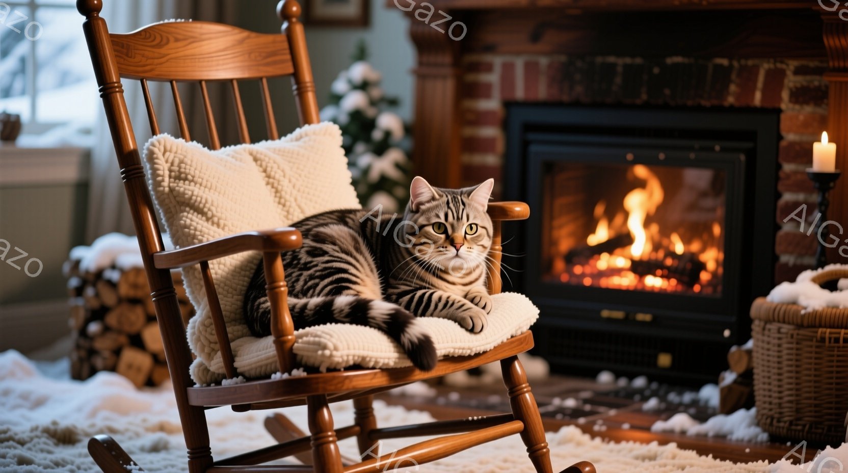 縞模様の猫が、クリーム色の毛布のかかったロッキングチェアにゆったりと横たわっています。暖炉の炎が暖かく、背景にはクリスマスツリーが飾られ、雪が降る冬の日の温かい家庭的な雰囲気が漂っています。柔らかい絨毯の上で、猫はリラックスした表情で静かに過ごしています。