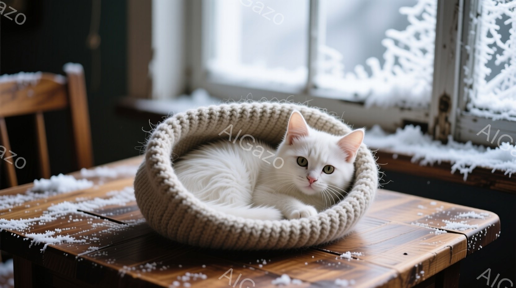 白い猫が、編み物のベッドに丸まって横たわっています。猫はカメラの方を見ており、穏やかでリラックスした表情を浮かべています。背景には雪が降る窓と、木製のテーブルが見え、全体的に暖かく穏やかな雰囲気です。