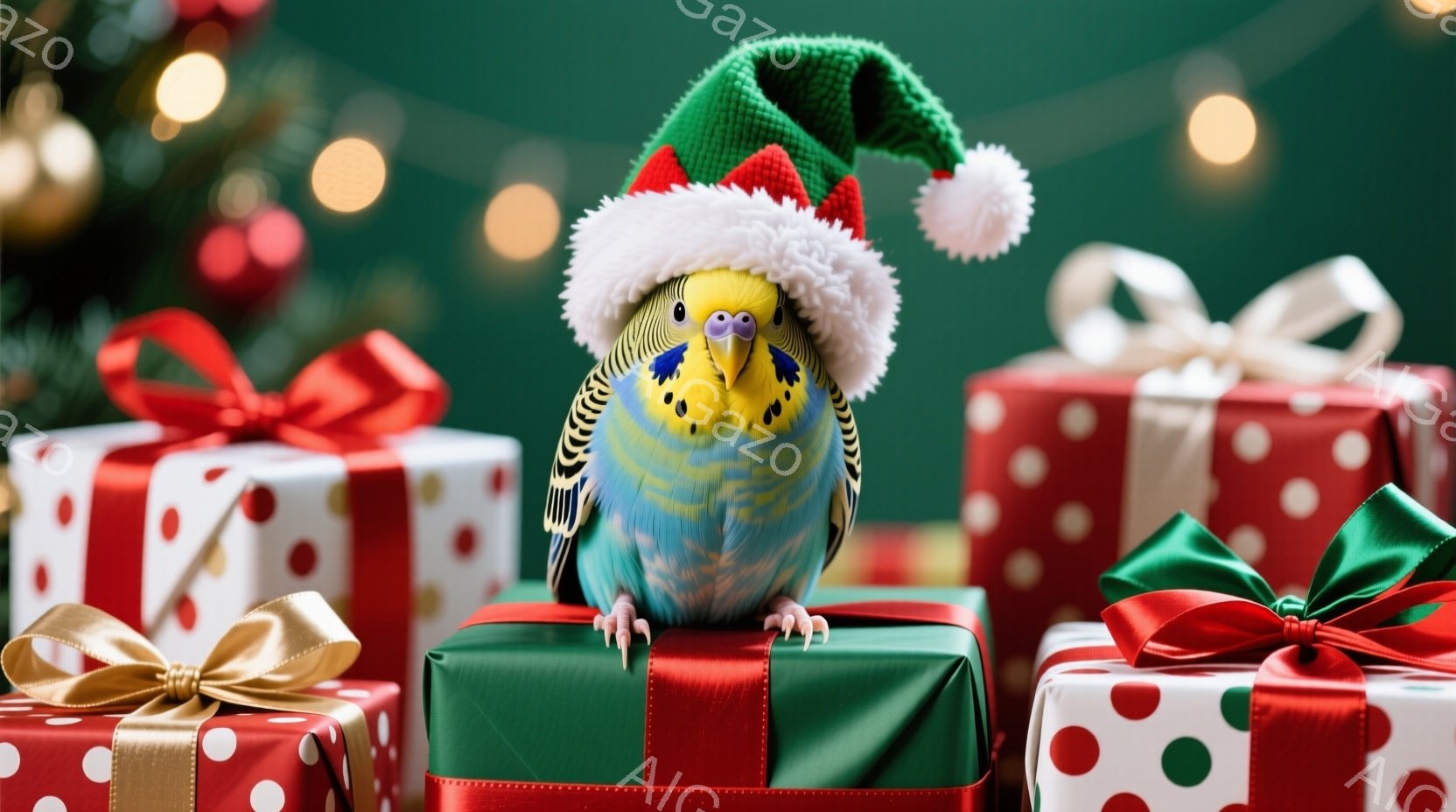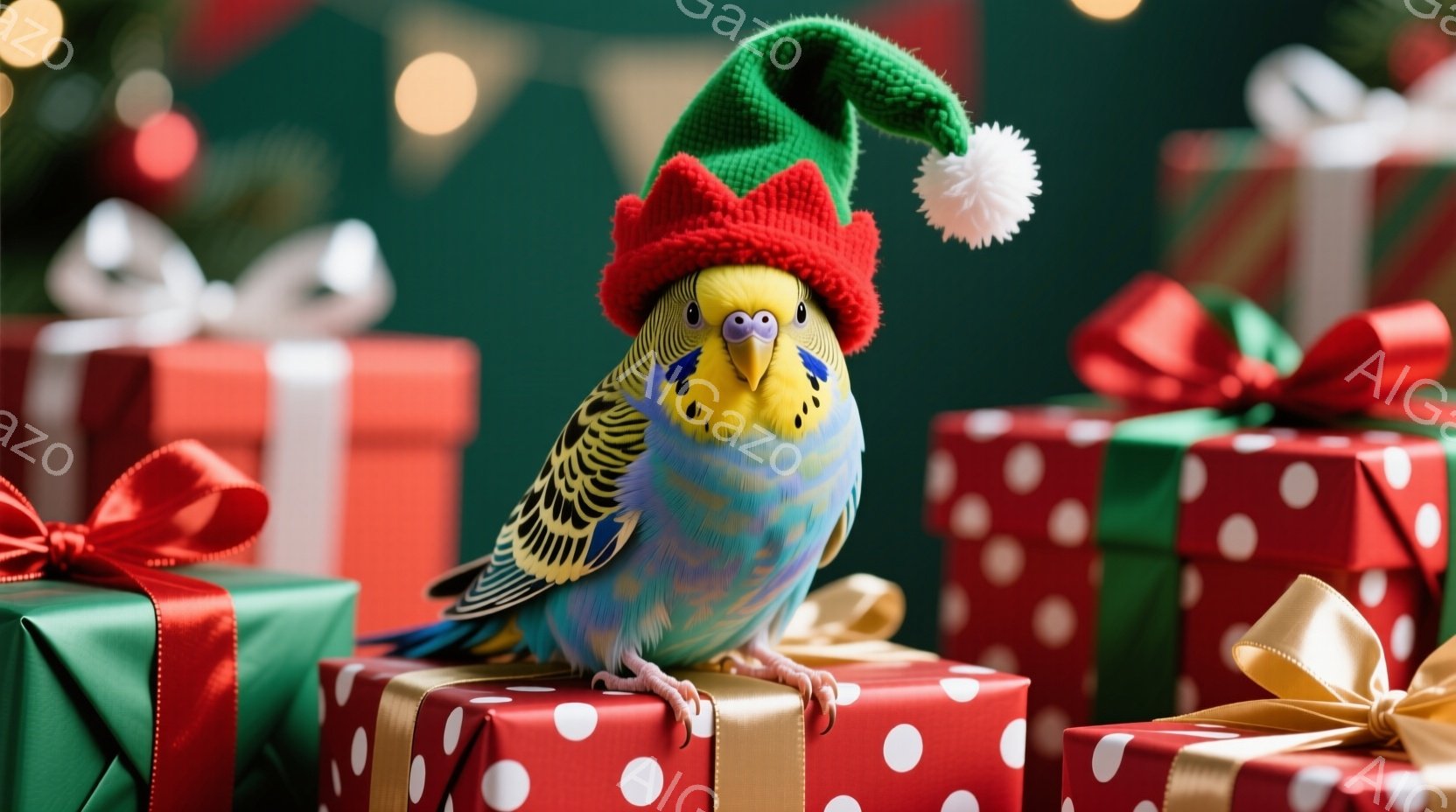 セキセイインコがクリスマスのプレゼントの山の上に立っており、頭にはサンタ帽をかぶっています。背景には、ぼやけたクリスマスツリーの飾りと、赤と緑の包装紙で包まれたプレゼント箱が並んでいます。全体的に、温かく、お祝いの雰囲気を醸し出しており、クリスマスの季節の喜びを表現しています。