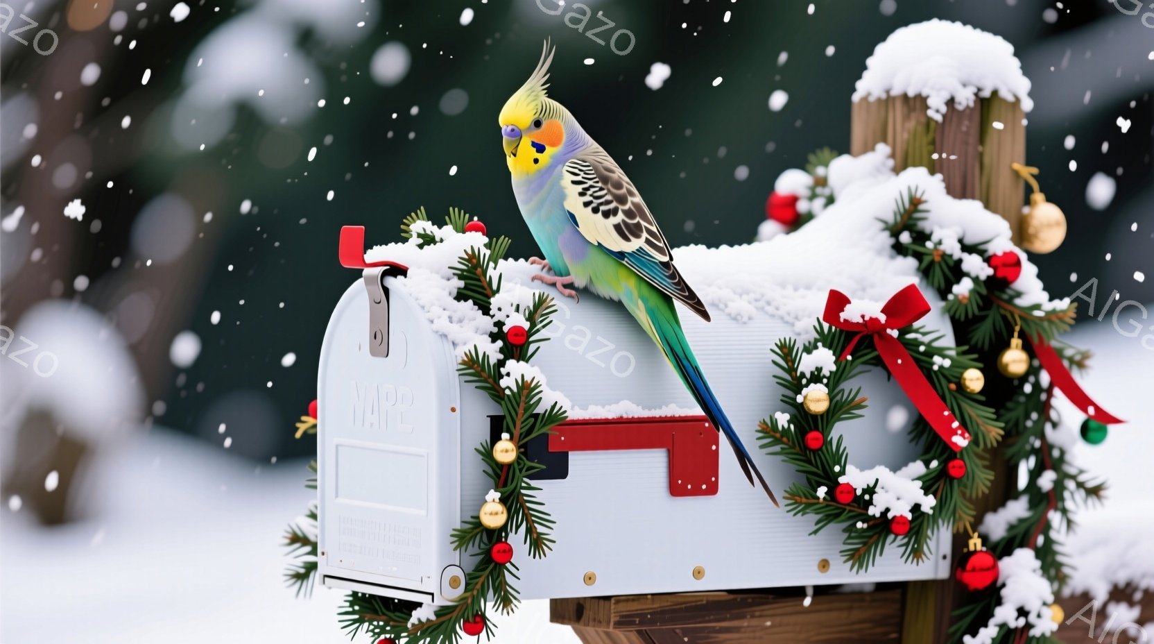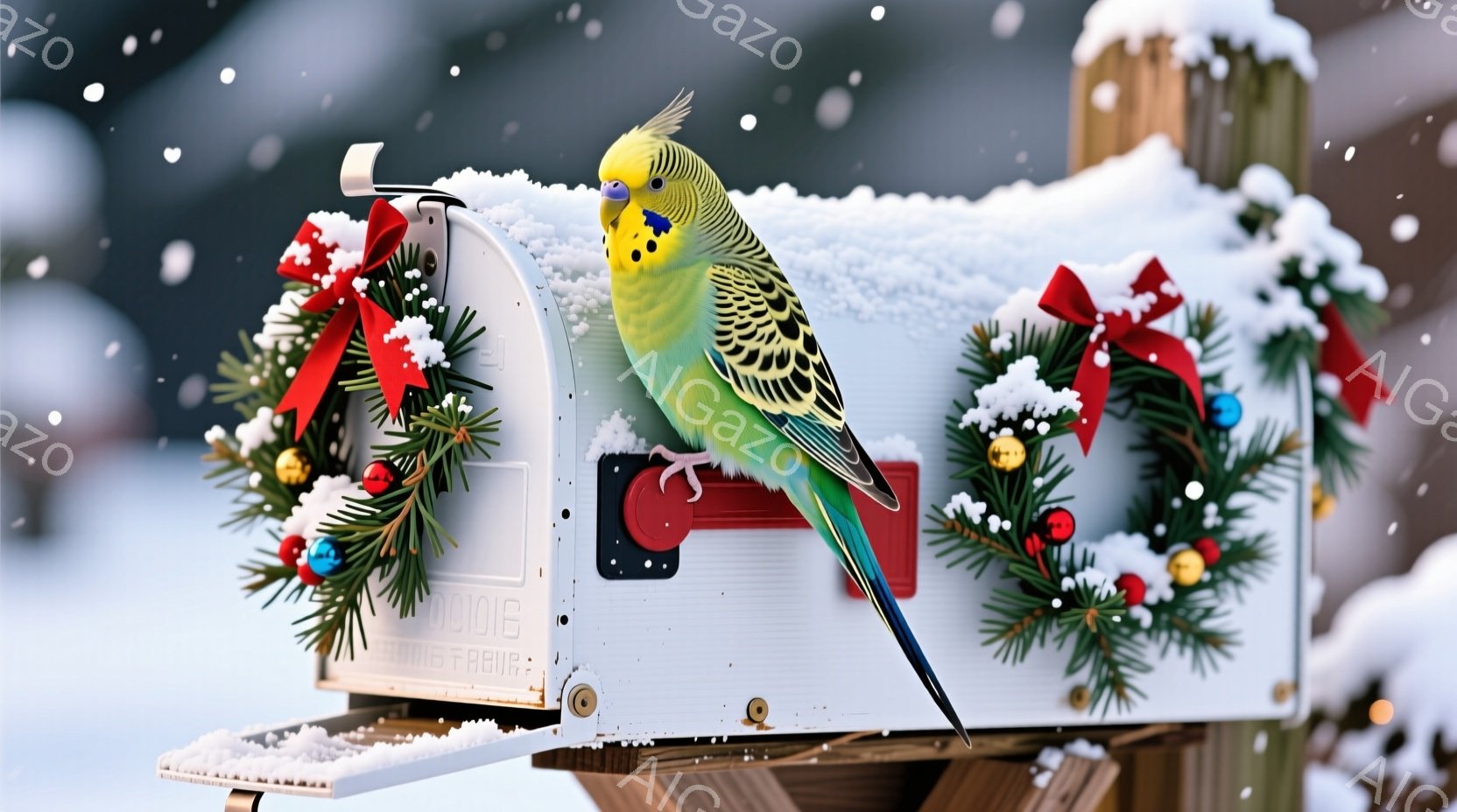 雪が舞う中で、白い郵便受けにセキセイインコがとまっています。郵便受けはクリスマスリースで飾られ、雪が積もっています。背景はぼやけた自然で、冬の静かで穏やかな雰囲気を醸し出しています。