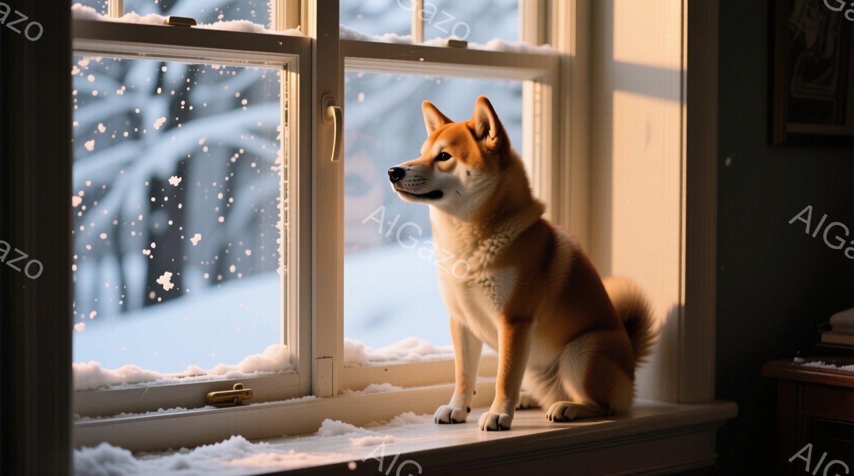 柴犬が窓辺に座り、雪景色を眺めている。窓の外は雪に覆われた森林で、雪が舞い散っている様子が伺える。室内は暖かく、ランプの光が犬を照らし、穏やかで静かな雰囲気が漂っている。