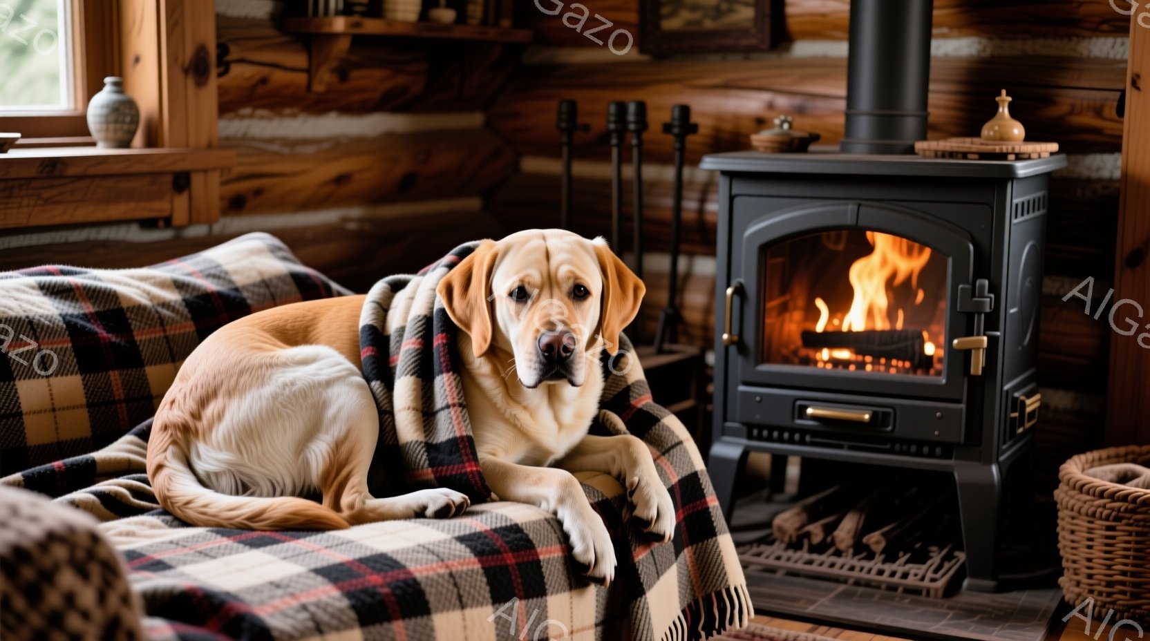 明るい毛並みのラブラドール・レトリバーが、赤と黒のチェック柄のブランケットの上に横たわっている。暖炉が燃えており、室内は木のぬくもりを感じさせる落ち着いた雰囲気だ。背景には薪が積まれ、冬の日の暖炉の前でくつろぐ穏やかな時間が表現されている。