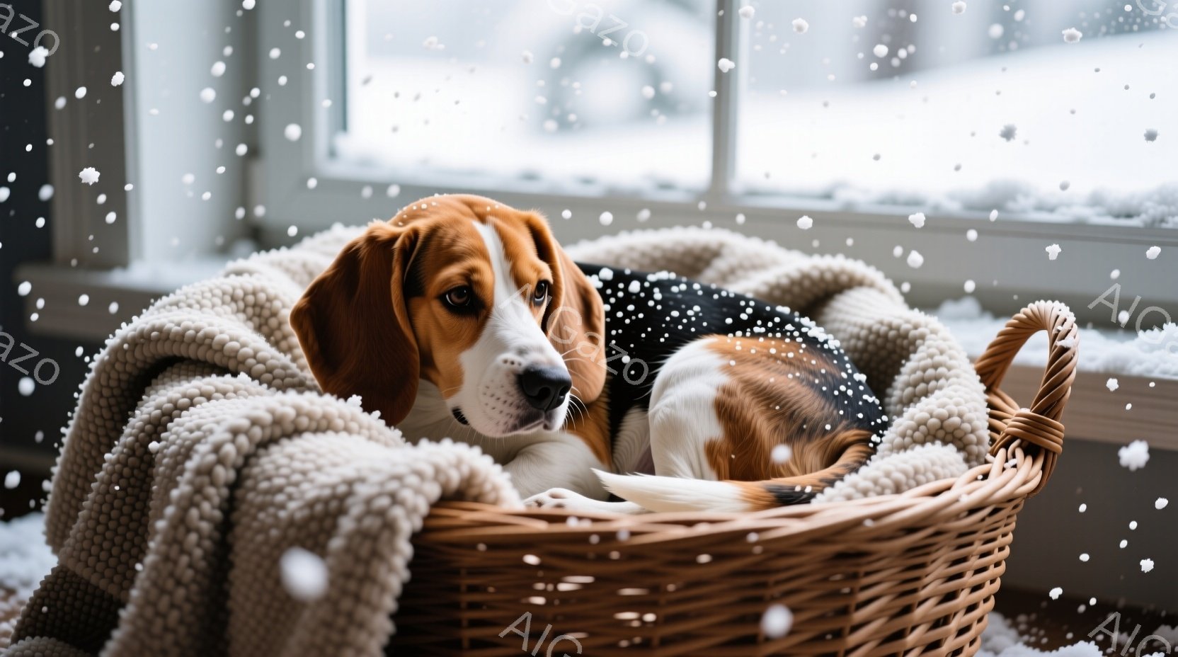 茶色と白のビーグル犬が、ふわふわの白い毛布で覆われた籐のバスケットの中に横たわっています。犬はリラックスした表情で、わずかに顔を上げてこちらを見ています。背景には雪が降る冬の景色が見え、暖かく穏やかな雰囲気が漂っています。