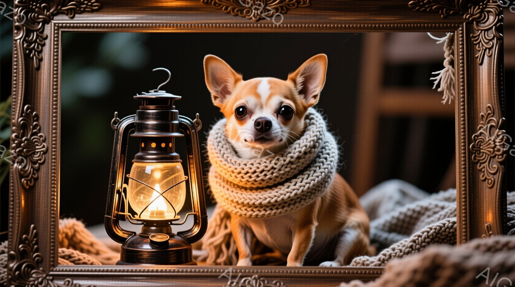 小さなチワワが、太めのオフホワイトの編みマフラーを巻いてカメラを見つめています。背景には、古い石油ランタンとロープ、そしてドライフラワーが配置されており、全体的に温かく落ち着いた雰囲気です。犬は前足を揃えて座っており、穏やかで少し控えめな表情をしています。