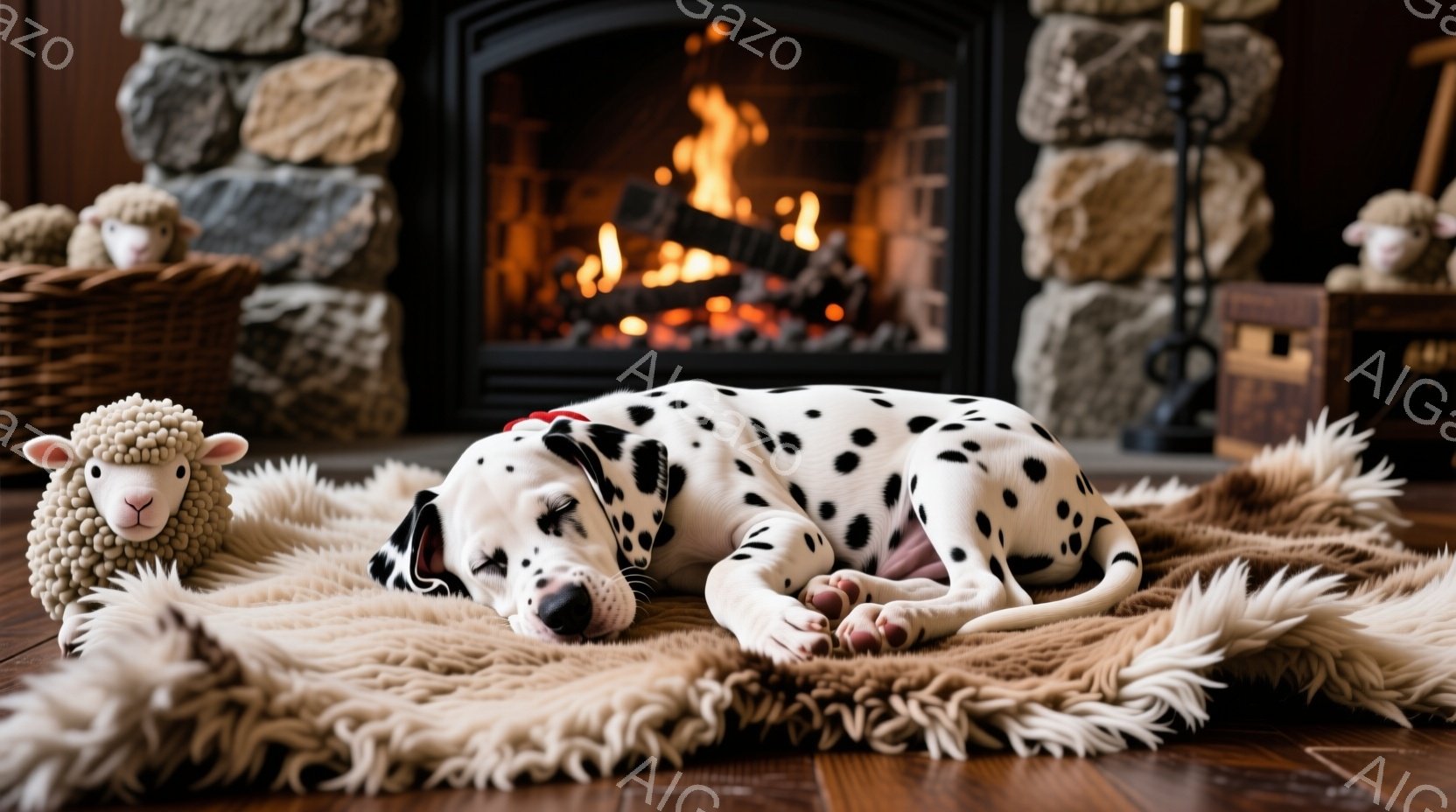 暖炉の前でダルメシアンの子犬が柔らかいラグの上で眠っています。子犬は白地に黒い斑点模様で、リラックスした姿勢で横たわり、小さなピンク色の鼻と穏やかな表情をしています。背景には石造りの暖炉があり、暖かく居心地の良い雰囲気を醸し出しています。