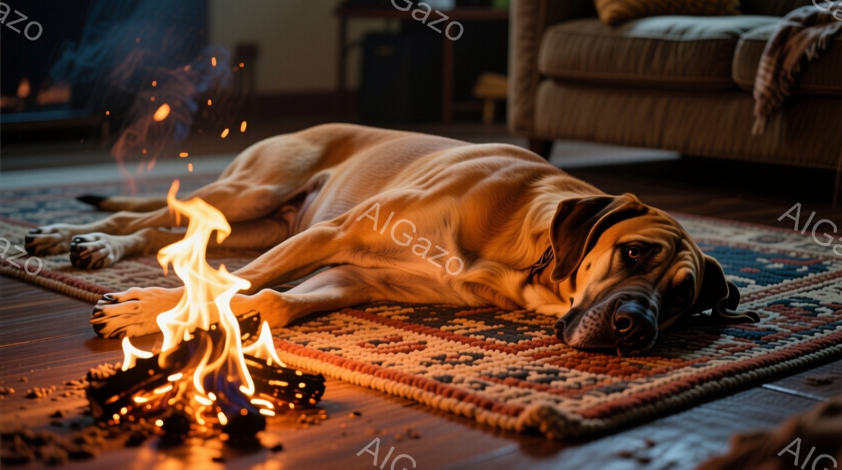 暖炉のそばに敷かれたカラフルな絨毯の上で、大きな犬が横たわっています。犬は白と茶色の毛並みで、少し眠そうな表情をしています。背景には木製の家具と暖炉の炎があり、温かく居心地の良い雰囲気が漂っています。