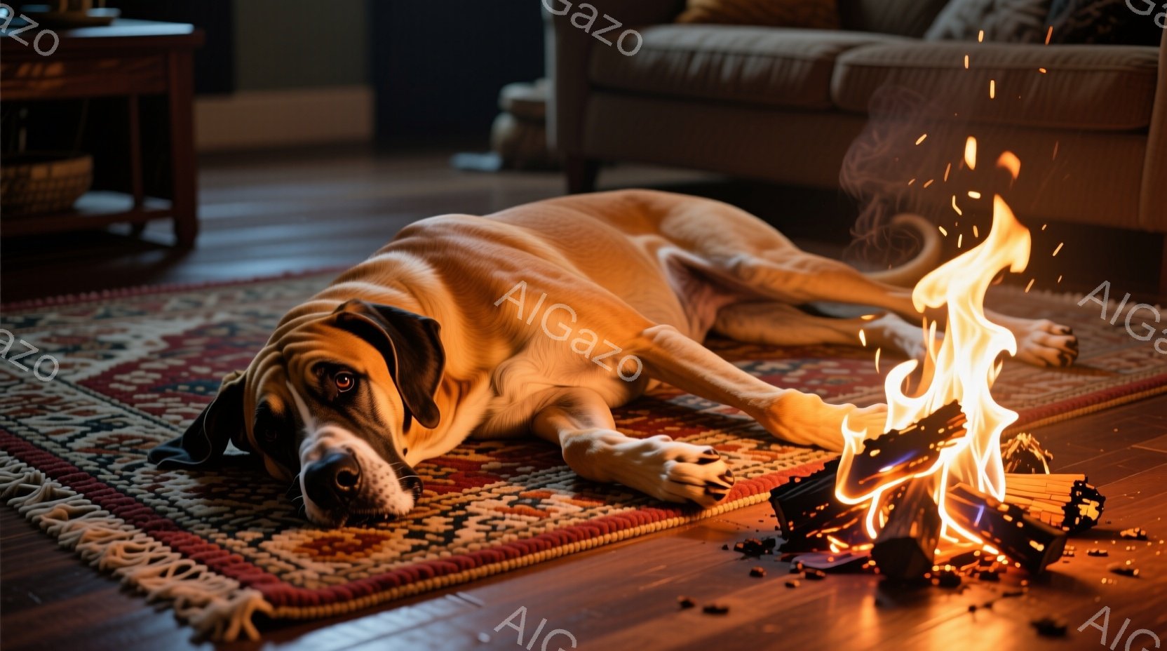 暖炉の前に敷かれた敷物の上で、大きな犬が横たわっています。犬はリラックスした表情で、暖炉の温かさを楽しんでいるようです。背景にはソファが見え、室内は落ち着いた雰囲気で、暖炉の炎が部屋を明るく照らしています。