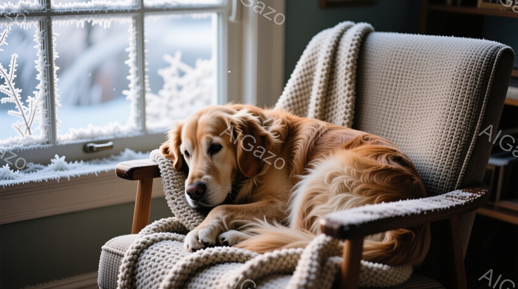 ゴールデンレトリバーが、クリーム色のざっくりとした編み物のブランケットをかけたロッキングチェアに横たわっています。窓の外は雪景色で、霜が降りており、暖かく居心地の良い室内とのコントラストが際立っています。犬はリラックスした表情で、穏やかで静かな雰囲気を醸し出しています。