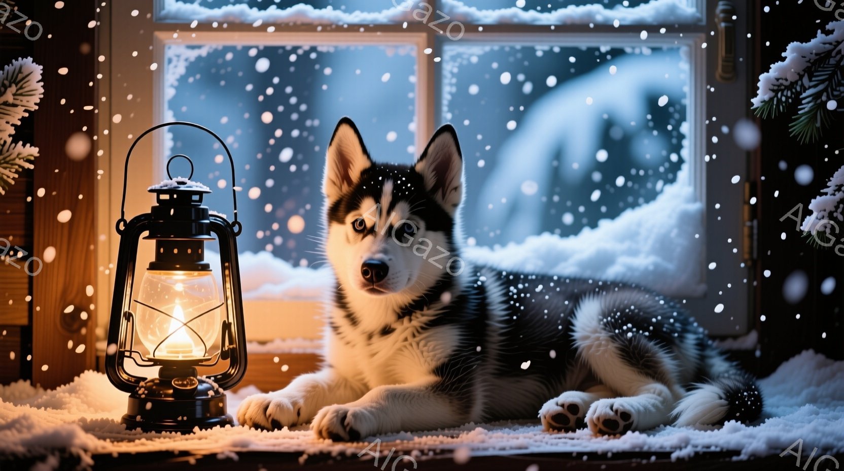縞模様の猫が窓辺に丸まって座っており、外の雪景色を眺めている。窓枠には雪が積もり、室内のテーブルの上には柔らかな光を放つランプが置かれている。全体的に暖かく、静かで、冬の穏やかな雰囲気が漂っている。