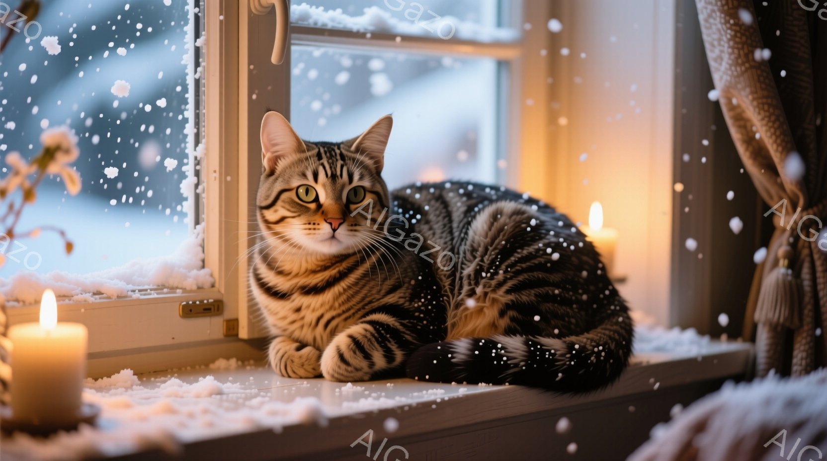 白い窓枠に縞模様の猫が丸まって座っており、外は雪が降っています。猫は落ち着いた表情で、室内からの暖かな光が猫の毛並みを照らし出しています。背景には家具や植物が見え、冬の静かで穏やかな雰囲気が漂っています。