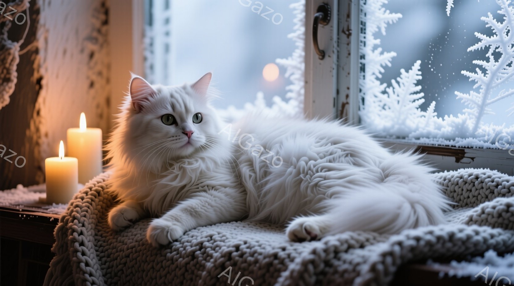 白い毛並みの長毛猫が、窓辺の白い編み物のブランケットの上に横たわっている。背景には雪模様の窓と、ぼんやりとした冬景色が見え、近くには灯されたキャンドルが暖かく照らしている。全体的に、静かで温かく、冬の穏やかな雰囲気が漂っている。