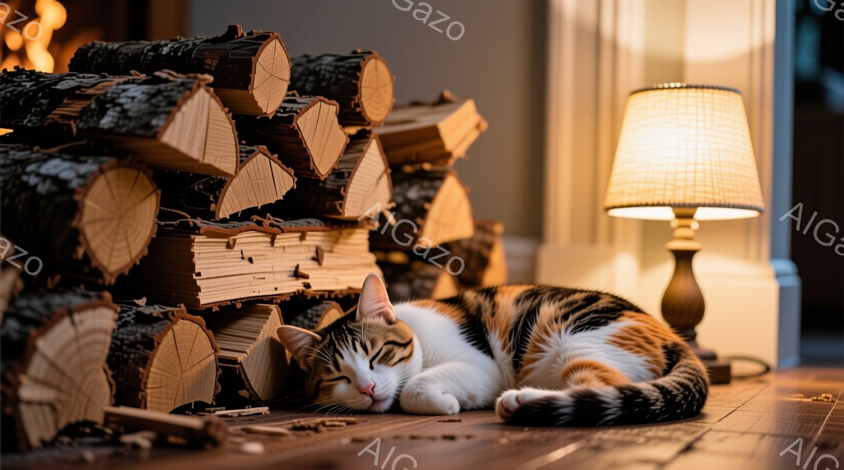 暖炉のそばに薪が積み上げられ、その近くで三毛猫が丸まって眠っている。猫は白を基調とした体に、茶色と黒の模様があり、リラックスした様子で目を閉じている。背景には、温かい光を放つランプと暖炉の炎が見え、居心地の良い、穏やかな雰囲気が漂っている。