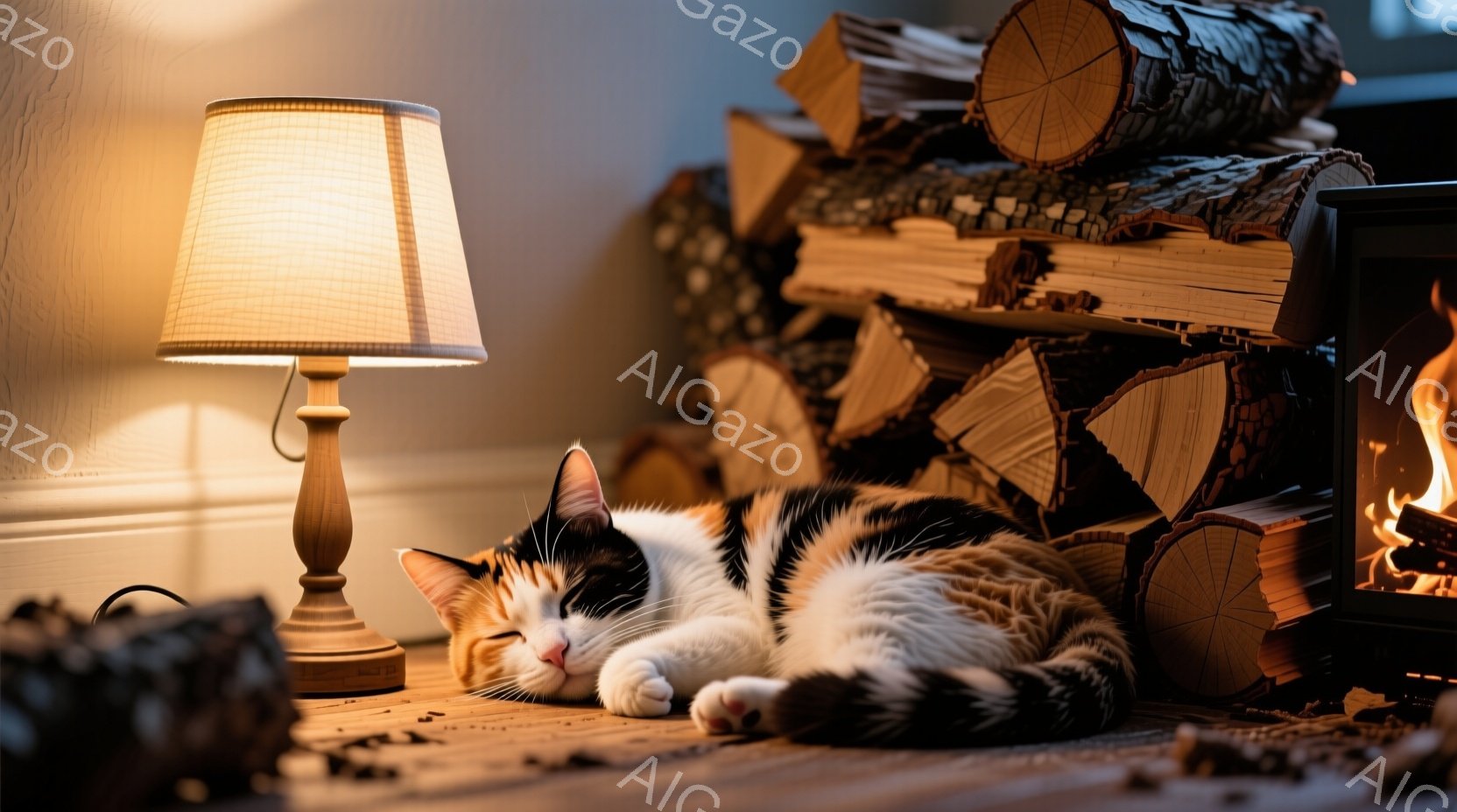 白と茶色の斑点模様の猫が木のそばの床で丸まって眠っている。背景には暖色のランプがあり、木の山と床の木屑が猫の周囲の温かみのある雰囲気を強調している。全体的に、穏やかでリラックスした、心地よい光に包まれた室内シーンである。