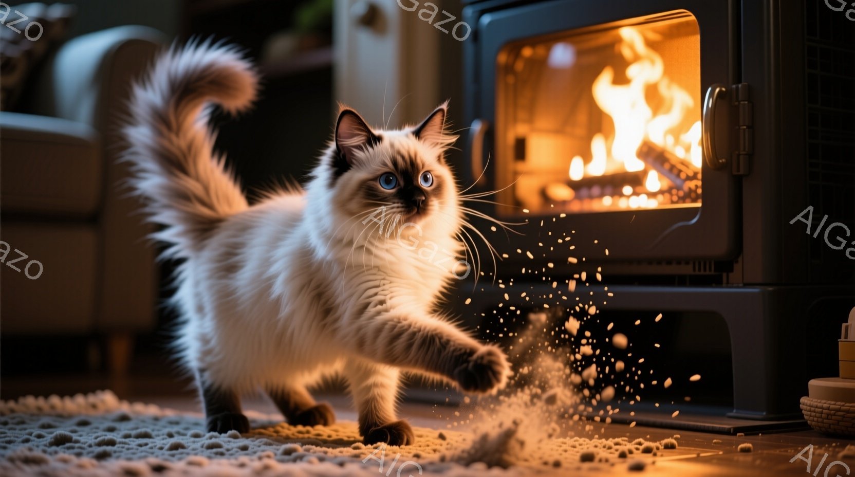 白と茶色の毛並みの美しい猫が、部屋の床で飛び跳ねて遊んでいる様子が写っている。背景には暖炉があり、炎が燃え盛って暖かさを感じさせる。全体的に、猫の活発な動きと暖炉の温かさが相まって、居心地の良い雰囲気が漂っている。