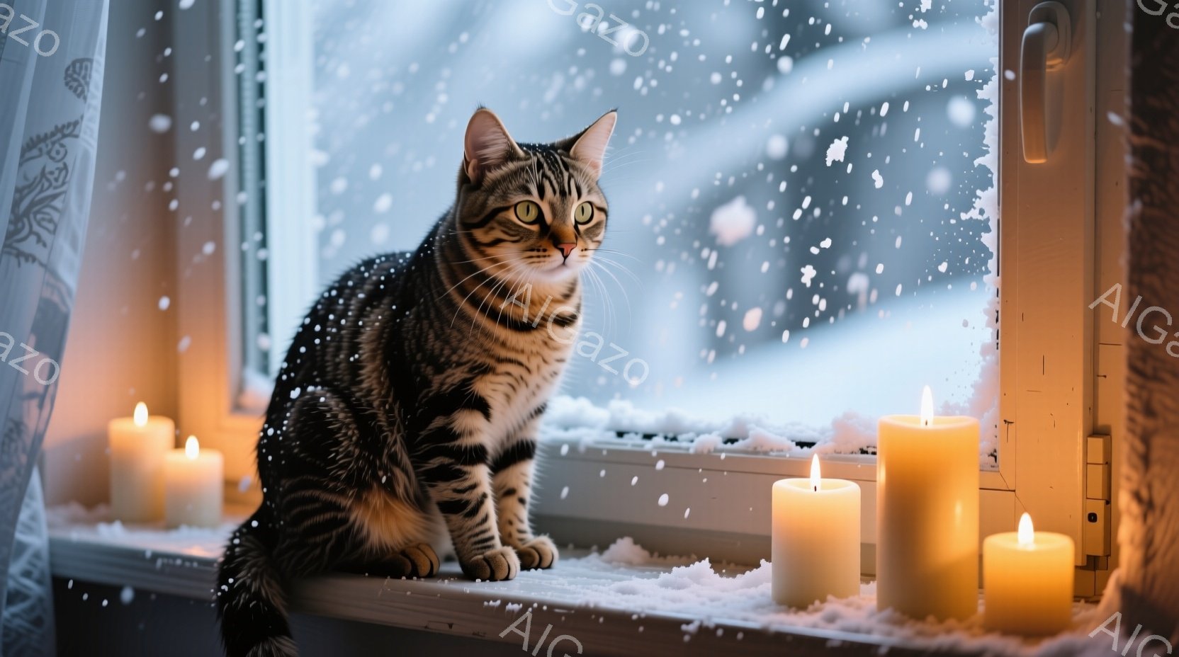 縞模様の猫が雪が降る窓辺に座り、こちらを見ています。窓の外は雪景色で、室内には白いキャンドルが数本置かれ、暖かく静かな雰囲気を醸し出しています。雪は窓枠にも積もり、冬の静寂と猫の穏やかな表情が印象的です。