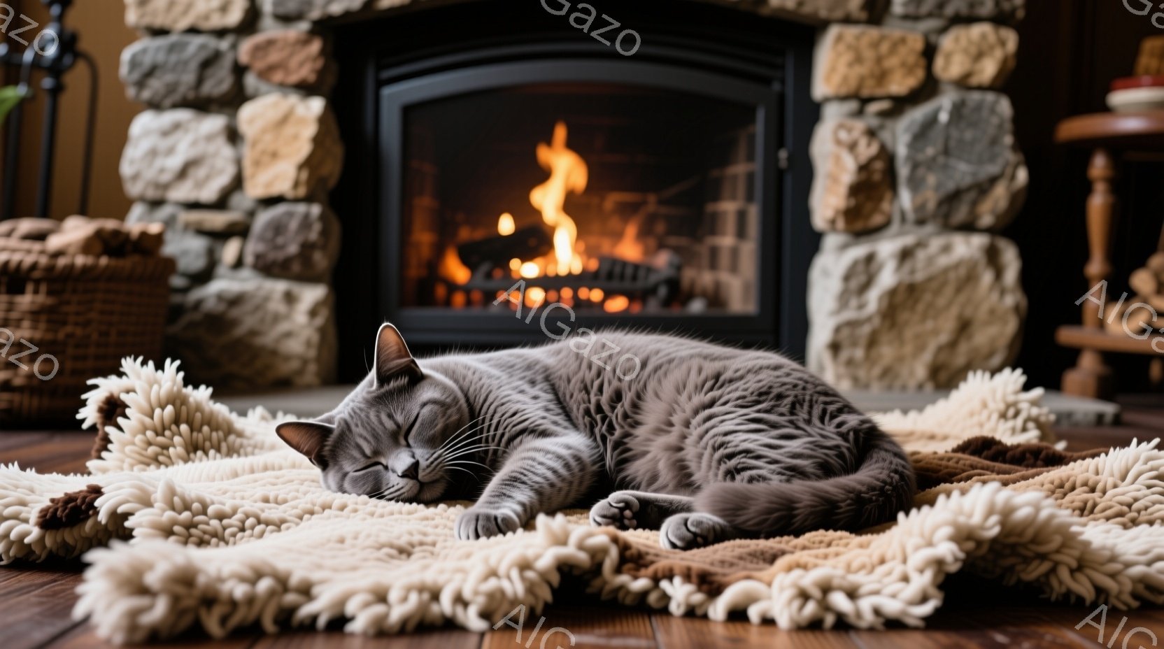 暖炉の前で、灰色の猫がふわふわのラグの上で目を閉じて横たわっています。その隣には白い羊のぬいぐるみが置かれ、リラックスした雰囲気を醸し出しています。背景には石造りの暖炉があり、炎が暖かく灯り、居心地の良い空間を作り出しています。