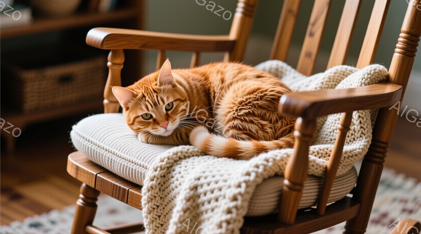 鮮やかなオレンジ色の縞模様の猫が、木製のロッキングチェアにゆったりと横たわっています。オフホワイトの編み物のようなブランケットが椅子の背もたれにかけられ、猫の体を優しく包み込んでいます。背景はぼやけていますが、室内の穏やかな雰囲気が伝わってきます。