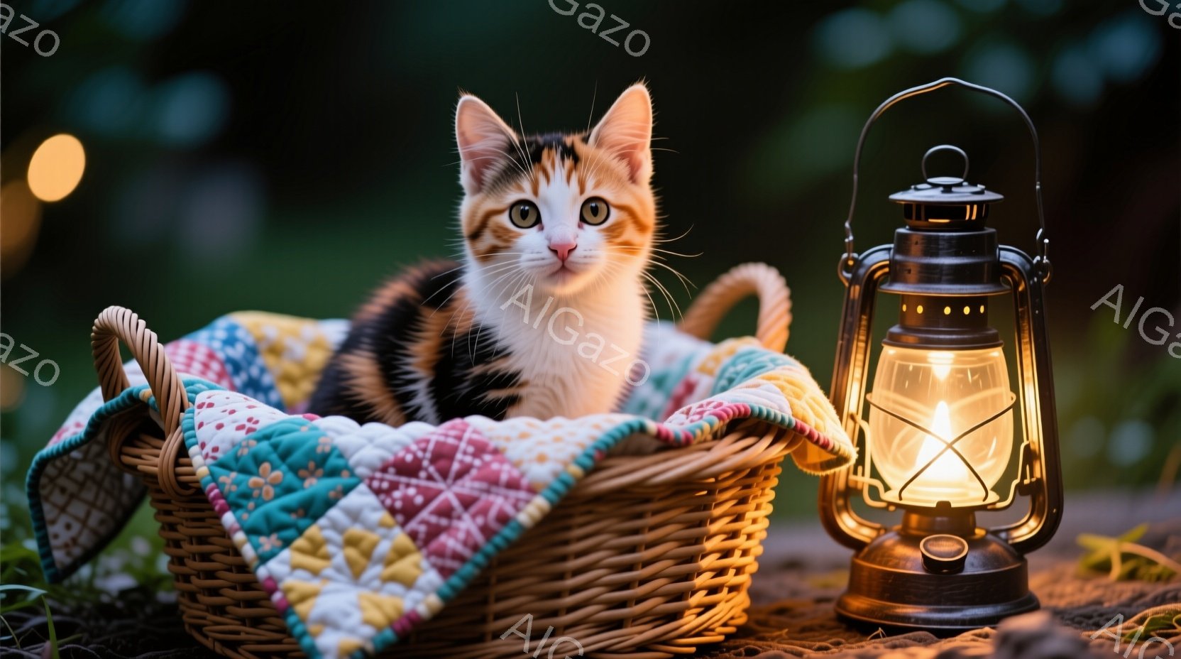 白と黒のまだら模様の小さな猫が、カラフルな編み物の毛布が敷かれた柳の籠の中に丸まって座っています。猫は大きな緑色の目をしており、好奇心と穏やかさを示す表情をしています。背景にはぼやけた緑の葉っぱと、暖かい光を放つランタンがあり、全体的に穏やかで心地よい雰囲気を醸し出しています。