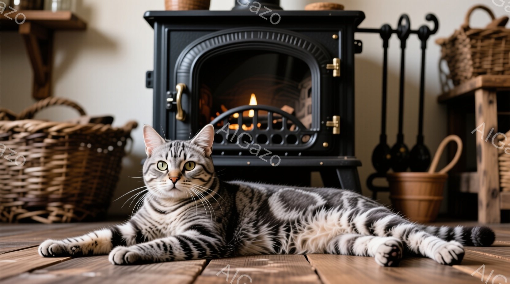 縞模様の猫が木製の床に横たわっており、リラックスした表情でこちらを見ている。背景には黒い暖炉があり、火が燃え、その周りには籐のバスケットや薪が置かれている。全体的に暖かく落ち着いた雰囲気で、猫がくつろいでいる様子が伝わってくる。