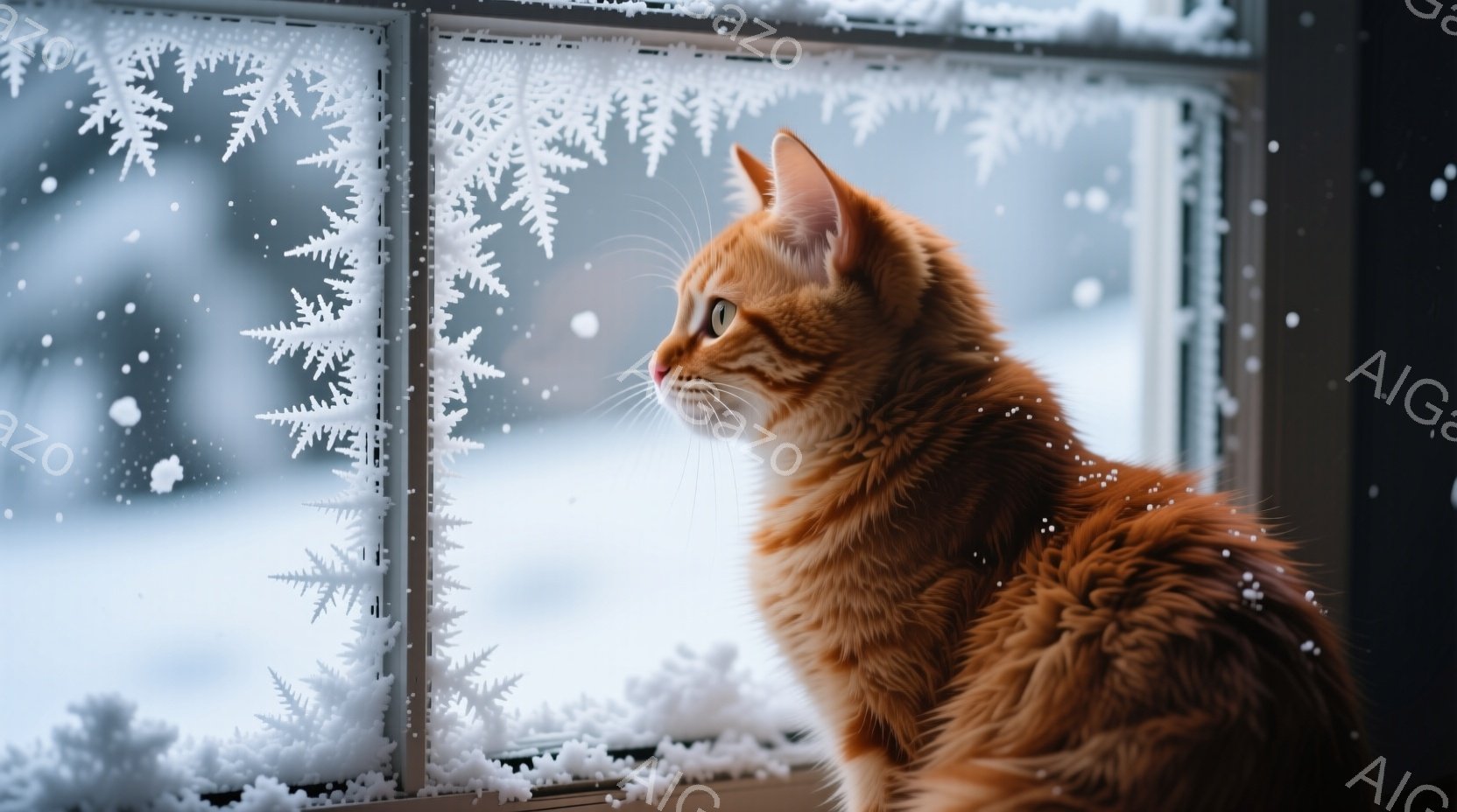 鮮やかなオレンジ色の毛並みの猫が、雪で覆われた窓の外を見つめている。猫は横向きで、少し上を見上げ、まるで何かを待っているかのような表情をしている。窓の外は雪景色で、繊細な雪の結晶がガラスに張り付いている様子が、冬の静けさを示唆している。
