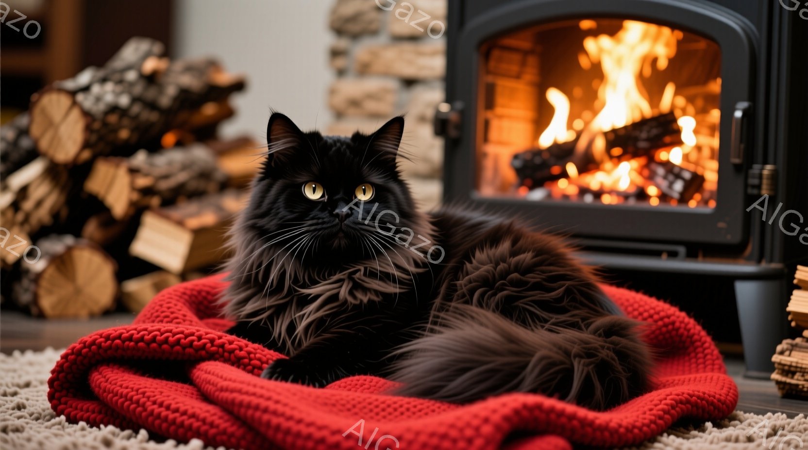 黒い毛並みの長い毛を持つ猫が、赤い編み物のブランケットの上にゆったりと横たわっています。猫は正面を見つめ、少し憂いを帯びた表情を浮かべており、その毛並みは光を受けて艶やかに輝いています。背景には暖炉があり、炎が燃え盛り、部屋全体を温かい雰囲気で包み込んでいます。