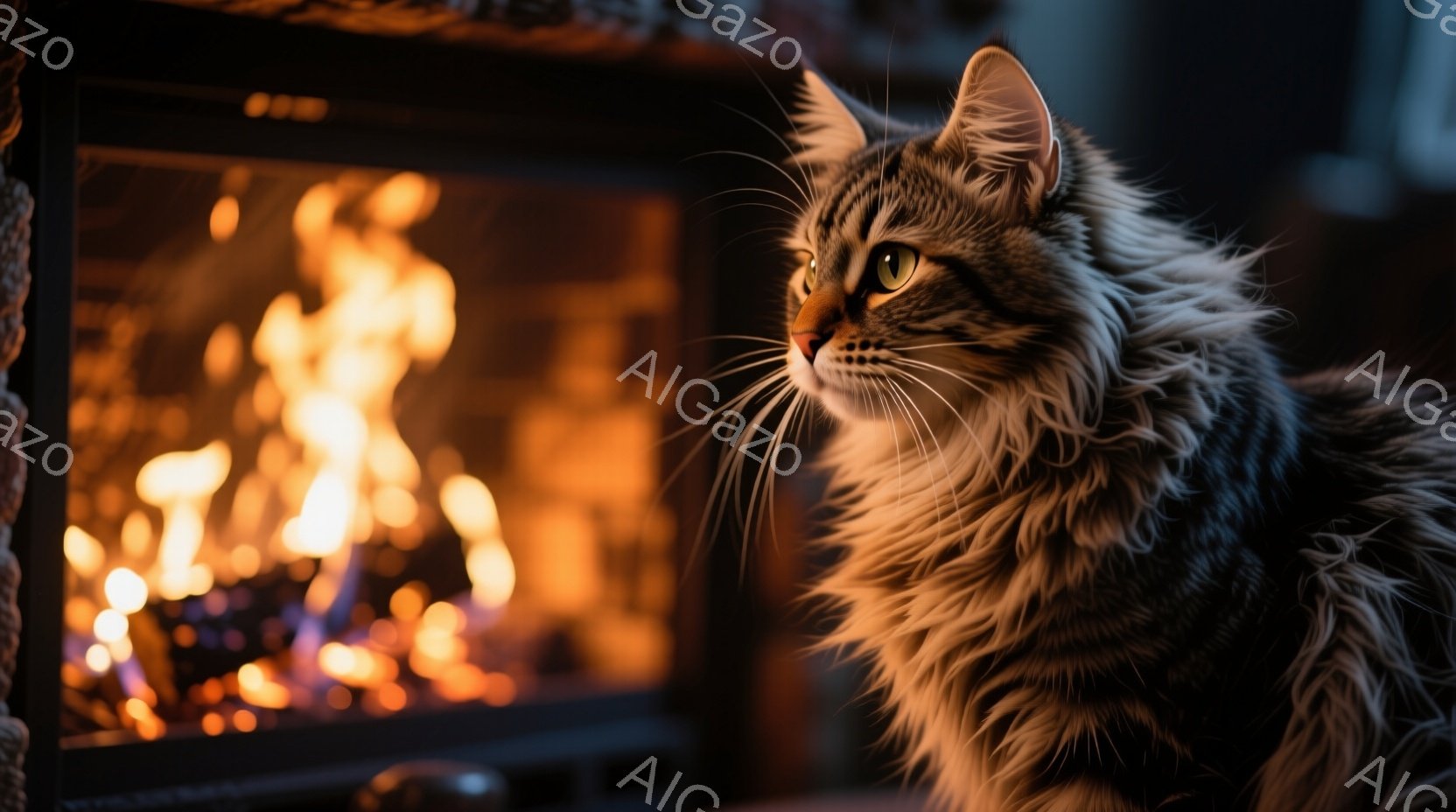 長毛の猫が暖炉のそばでリラックスした様子が捉えられています。猫は暗い毛並みで、オレンジ色の炎の光がその毛並みを照らし、その表情は穏やかで、どこか遠くを見つめているようです。暖炉のレンガの壁と燃え盛る炎が、暖かく居心地の良い雰囲気を醸し出しています。