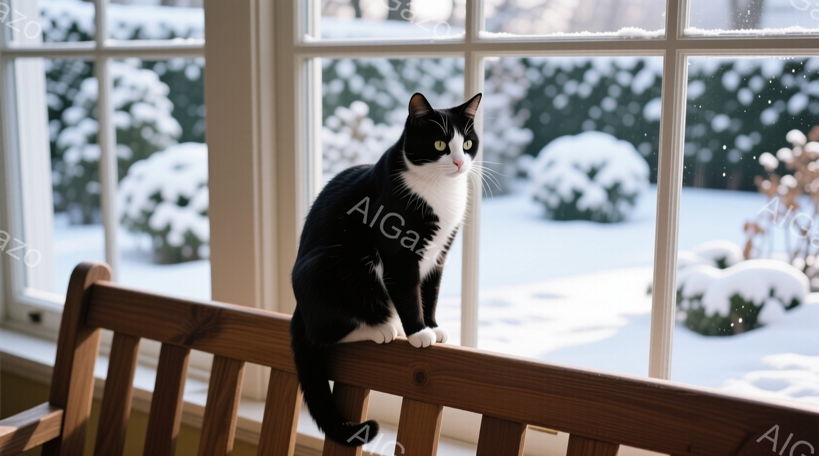 白と黒の猫が、雪景色を背景にした木の柵の上に座っています。猫は前足を揃えて座り、後ろ足は垂らし、長い尾は柵から伸びています。外は雪が降り積もり、庭の植物や木々は真っ白に覆われ、冬の静寂な雰囲気が漂っています。
